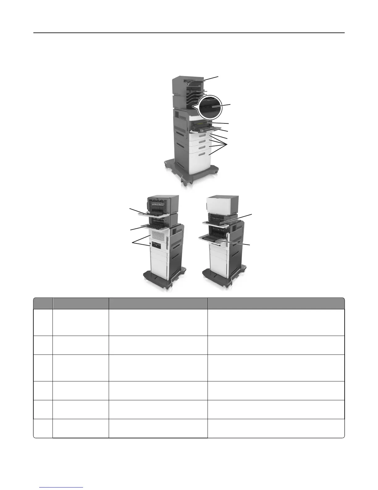 6 Trays [x]‑page jam, open tray [x]. [24x] Pull out the indicated tray, and then remove the