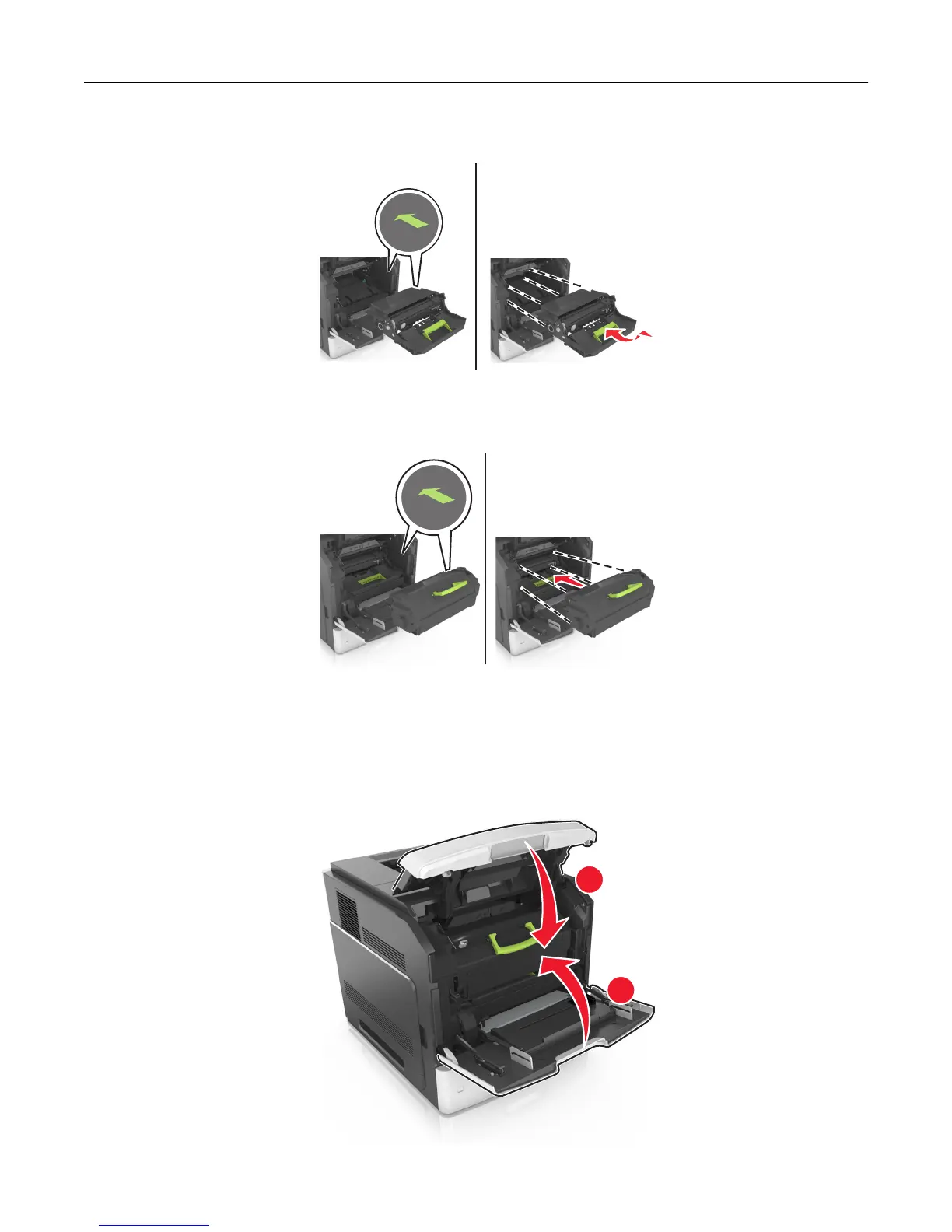 8 Insert the cartridge into the printer, and then push the green handle back into place.