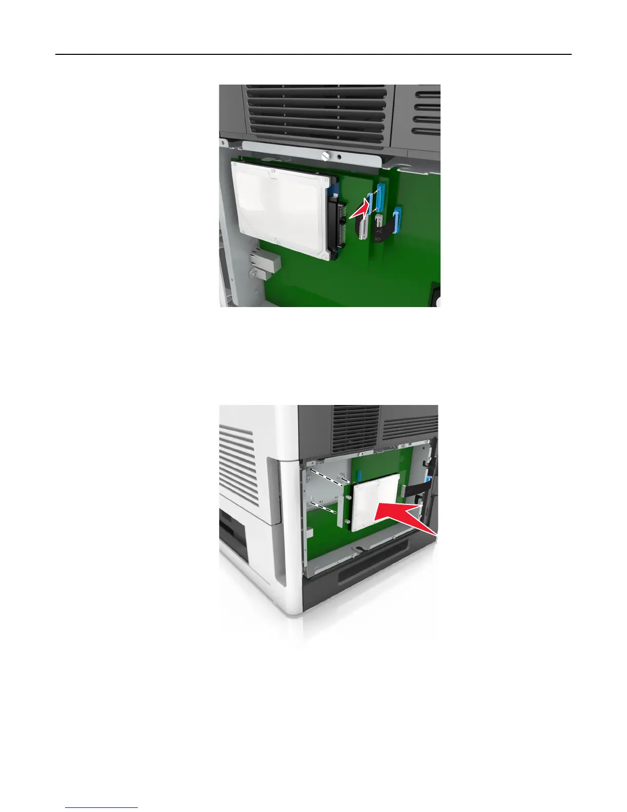 a Align the standoffs of the printer hard disk to the holes in the controller board cage, and then press the printer