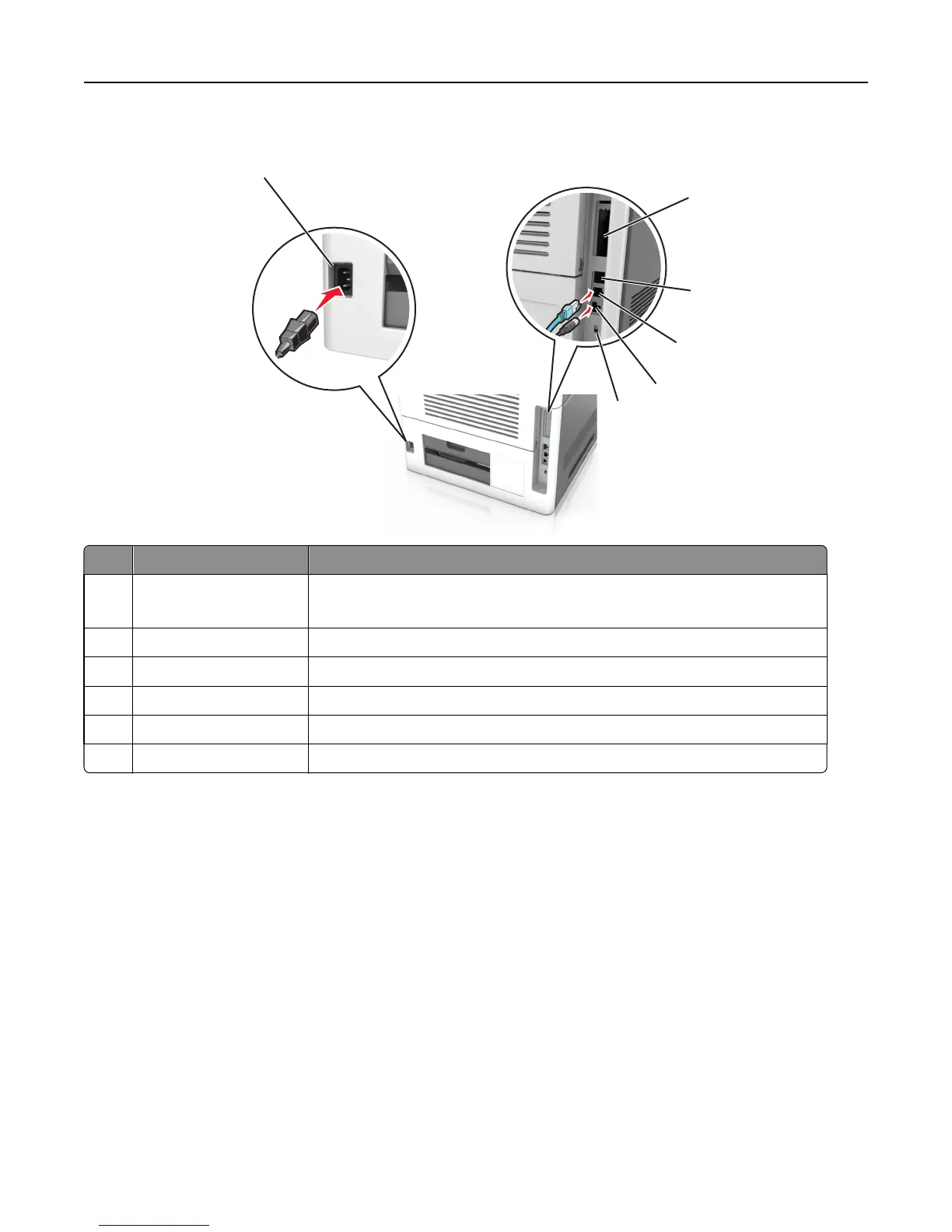 6 Printer power cord socket Connect the printer to a properly grounded electrical outlet.