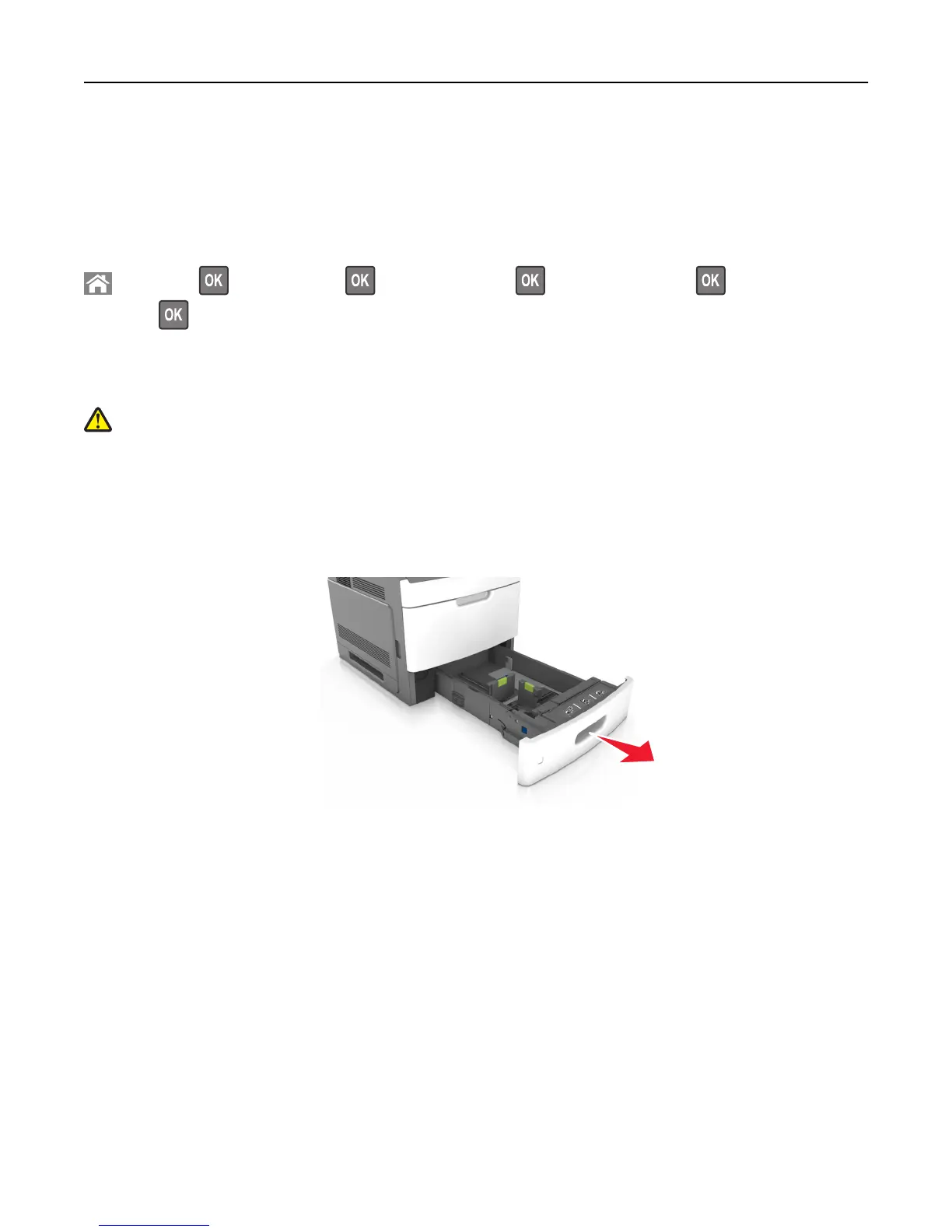 • Avoid removing trays while a job prints or while Busy appears on the display. Doing so may cause a jam.