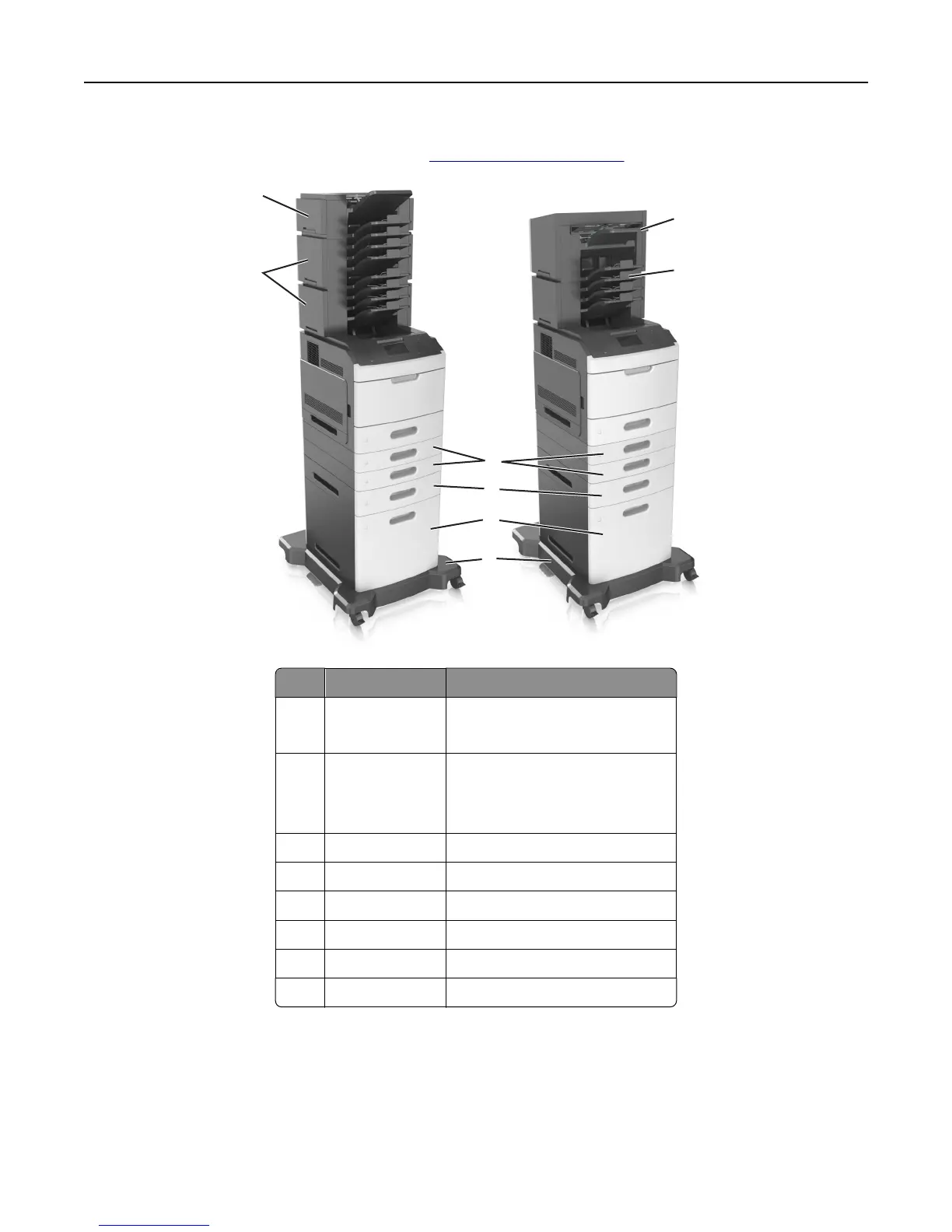 The following illustration shows the maximum number of optional finishers and trays that are supported by the printer.