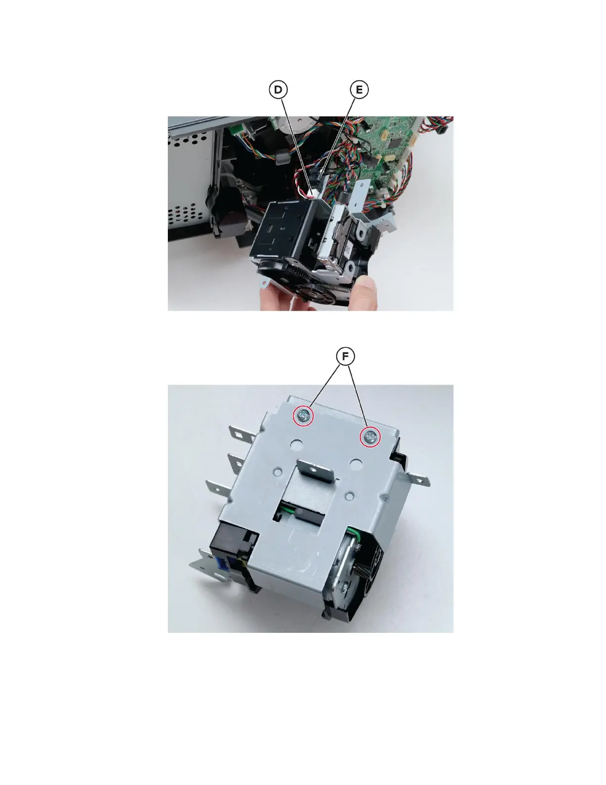 4 Disconnect the cable connector (D), and then remove the sensor (SHPF staple throat paper present) (E).