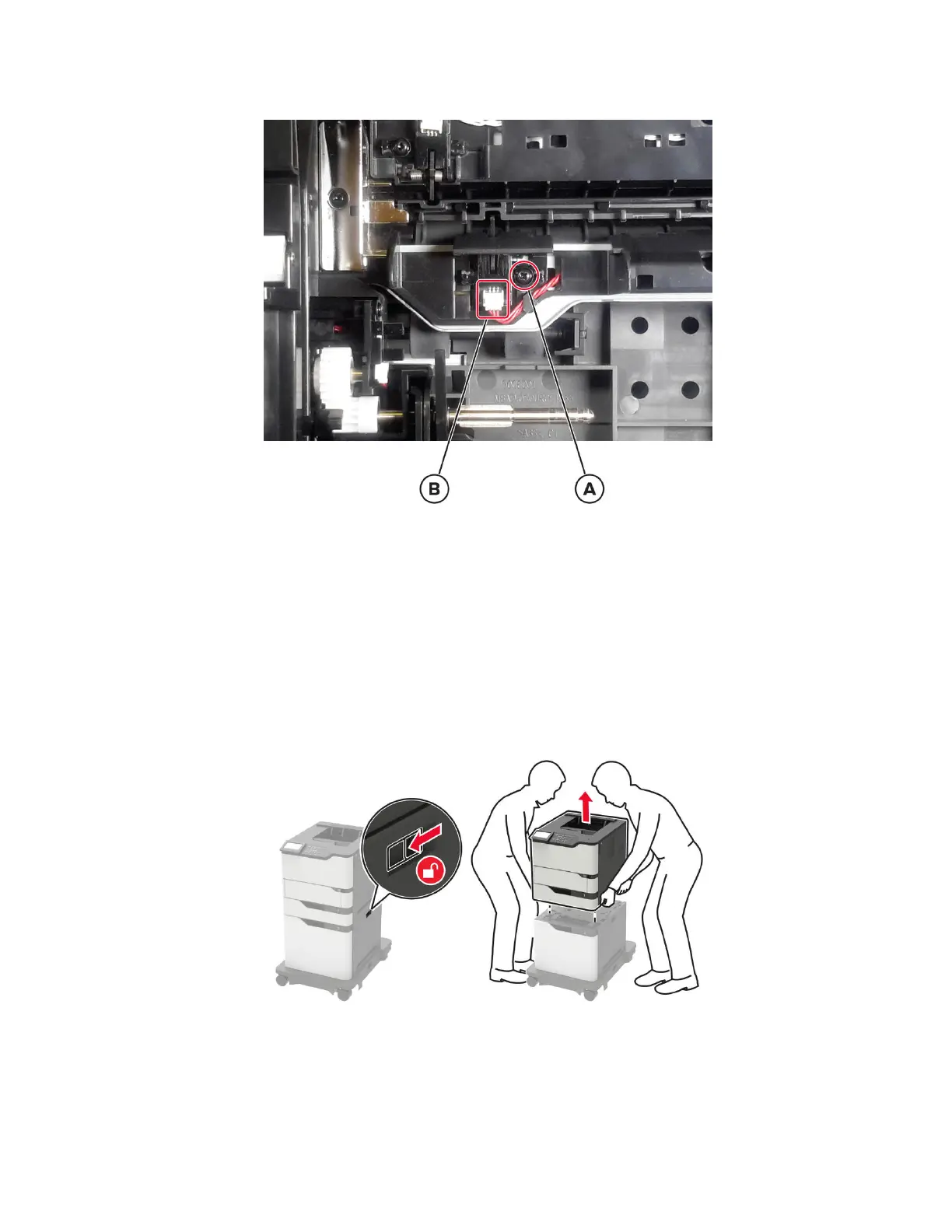 2 Lift the printer or optional tray above the 2100‑sheet tray, and then separate the 2100‑sheet tray.