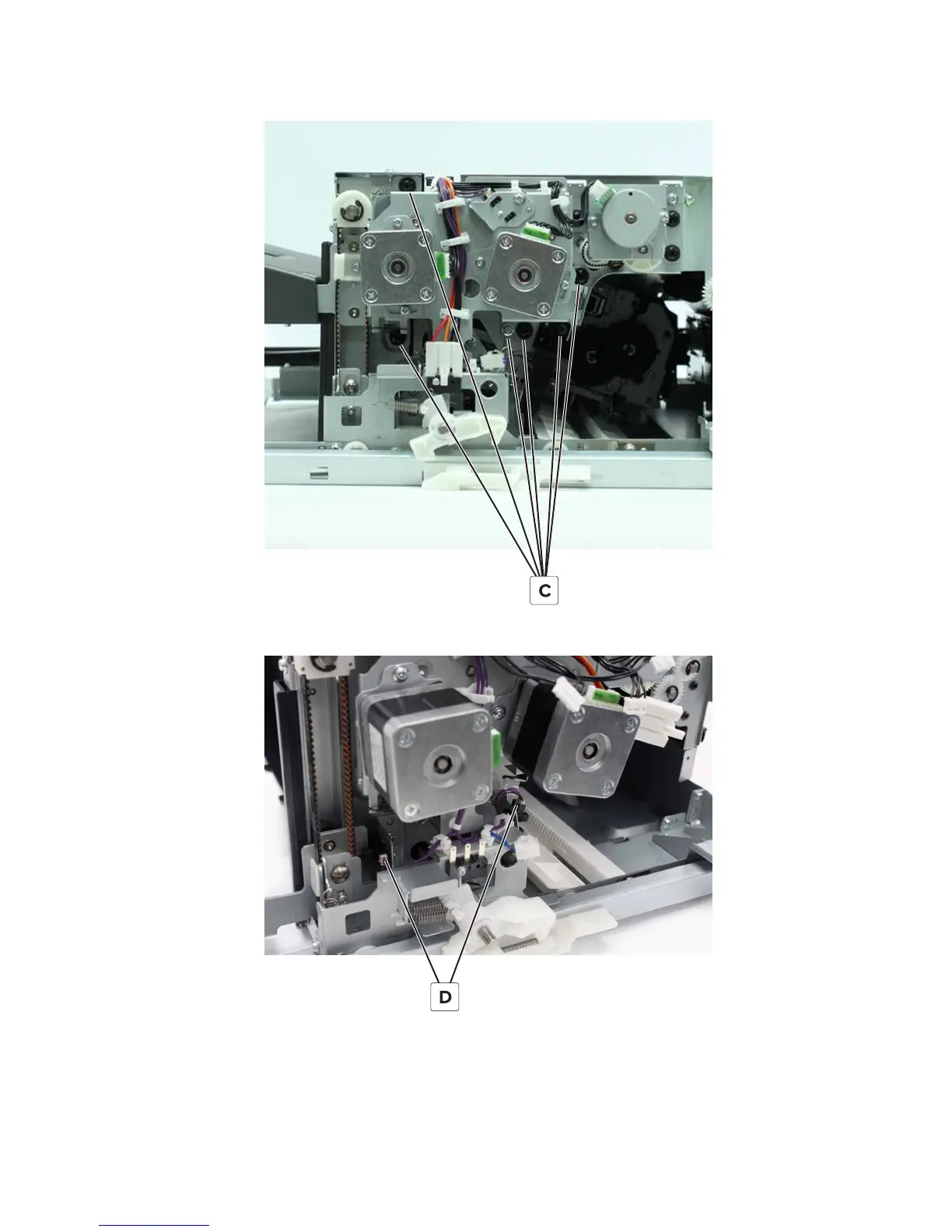 5 Remove the staple unit carriage home sensor cover, and then disconnect the two cables (D).