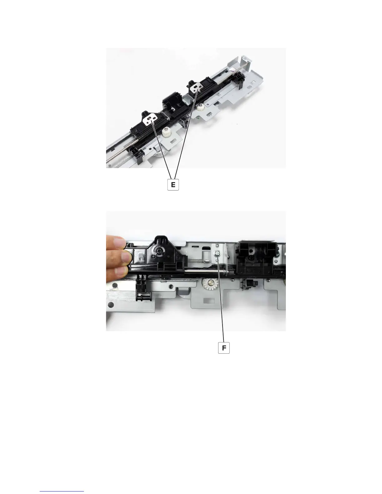 23 Slide the carriage, remove the screw (F), and then remove the bracket.