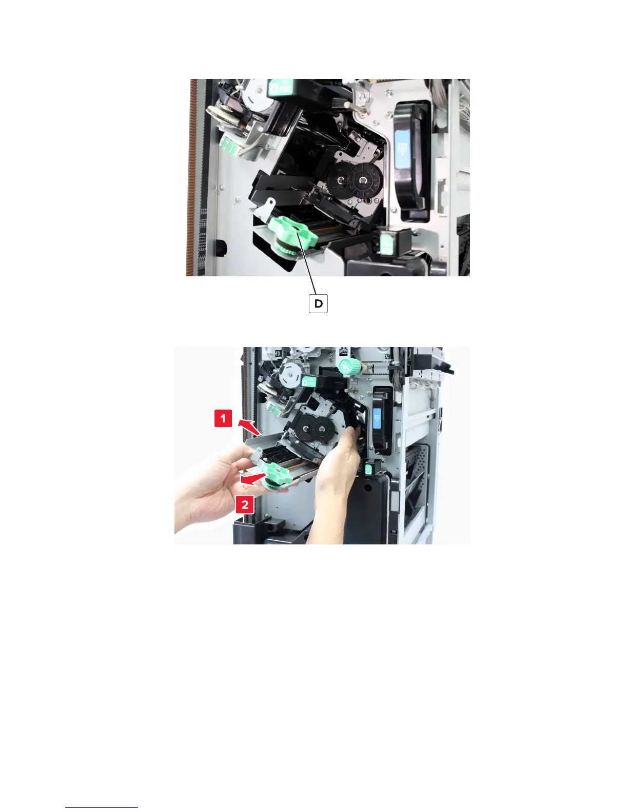 5 Turn the knob (D) to move the staple unit under the front aligner.