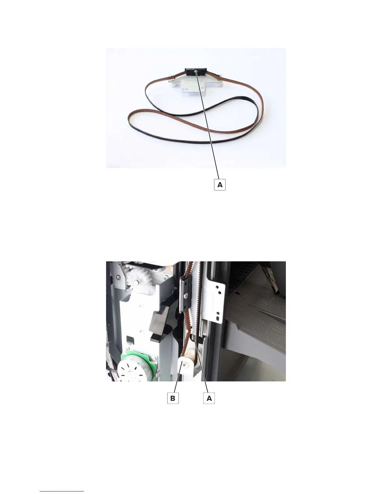 d Mount the bottom elevator gear brackets (B) on the finisher frame. Do not tighten the bracket screws.
