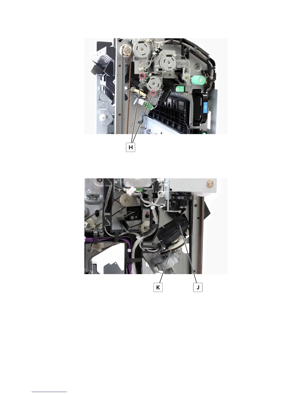 18 Remove the two screws (H), and then set aside the motor bracket.