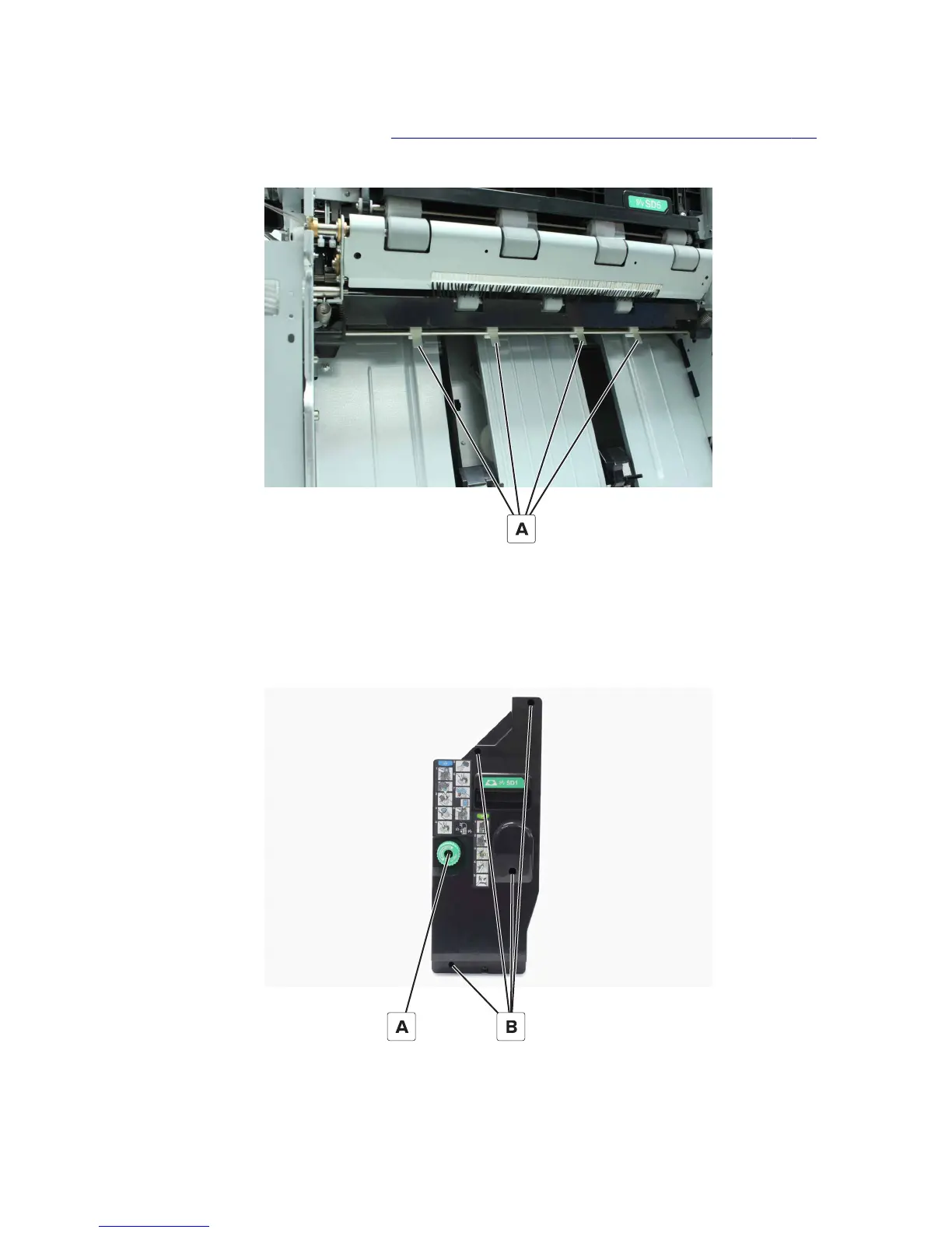 1 Remove the aligner jam access cover. See “Booklet maker aligner jam access door removal” on page 460.