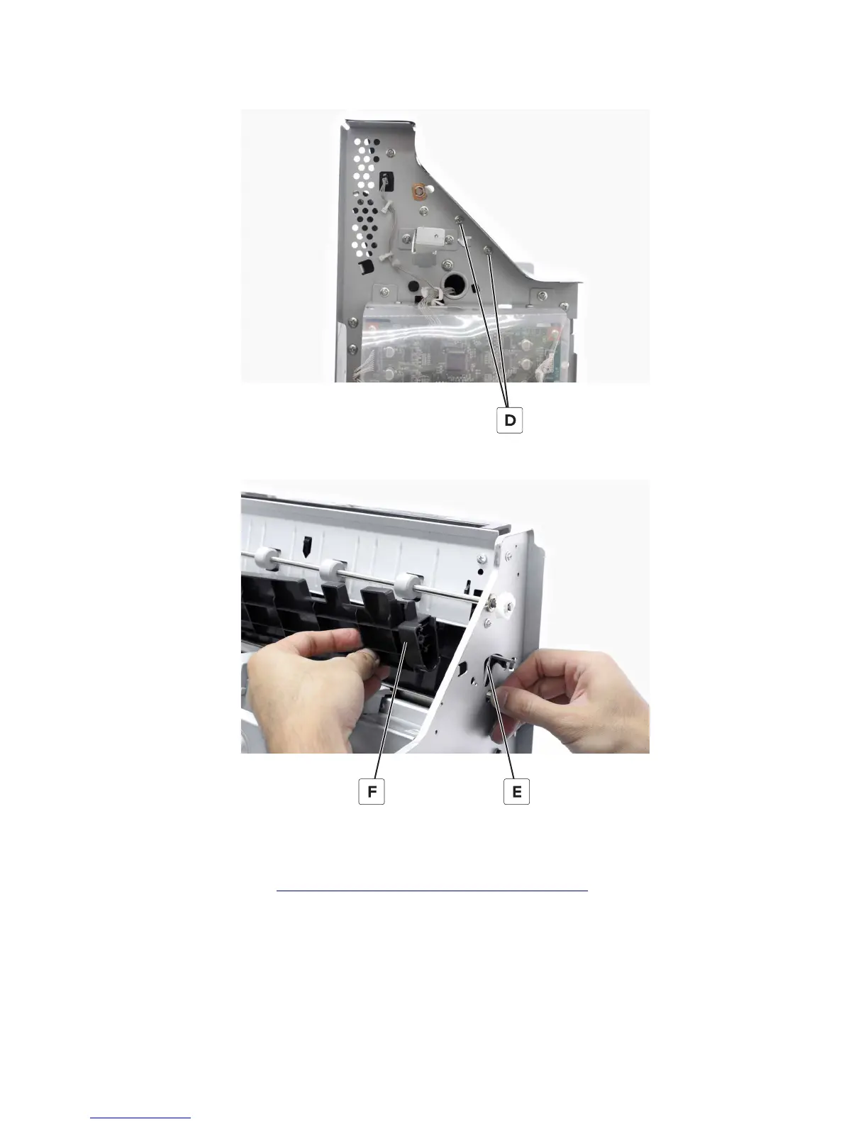 7 Separate the shaft and plate (E), and then remove the guide (F).