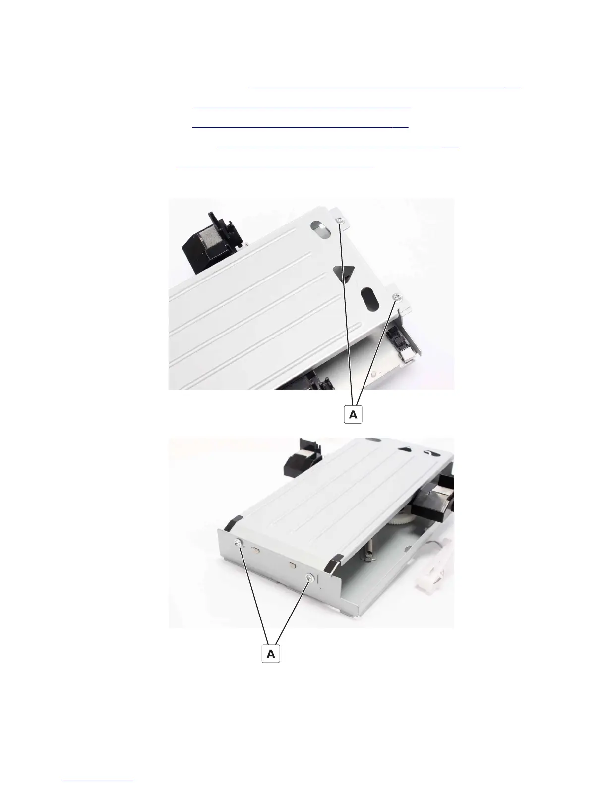6 Remove the four screws (A), and then remove the guide.