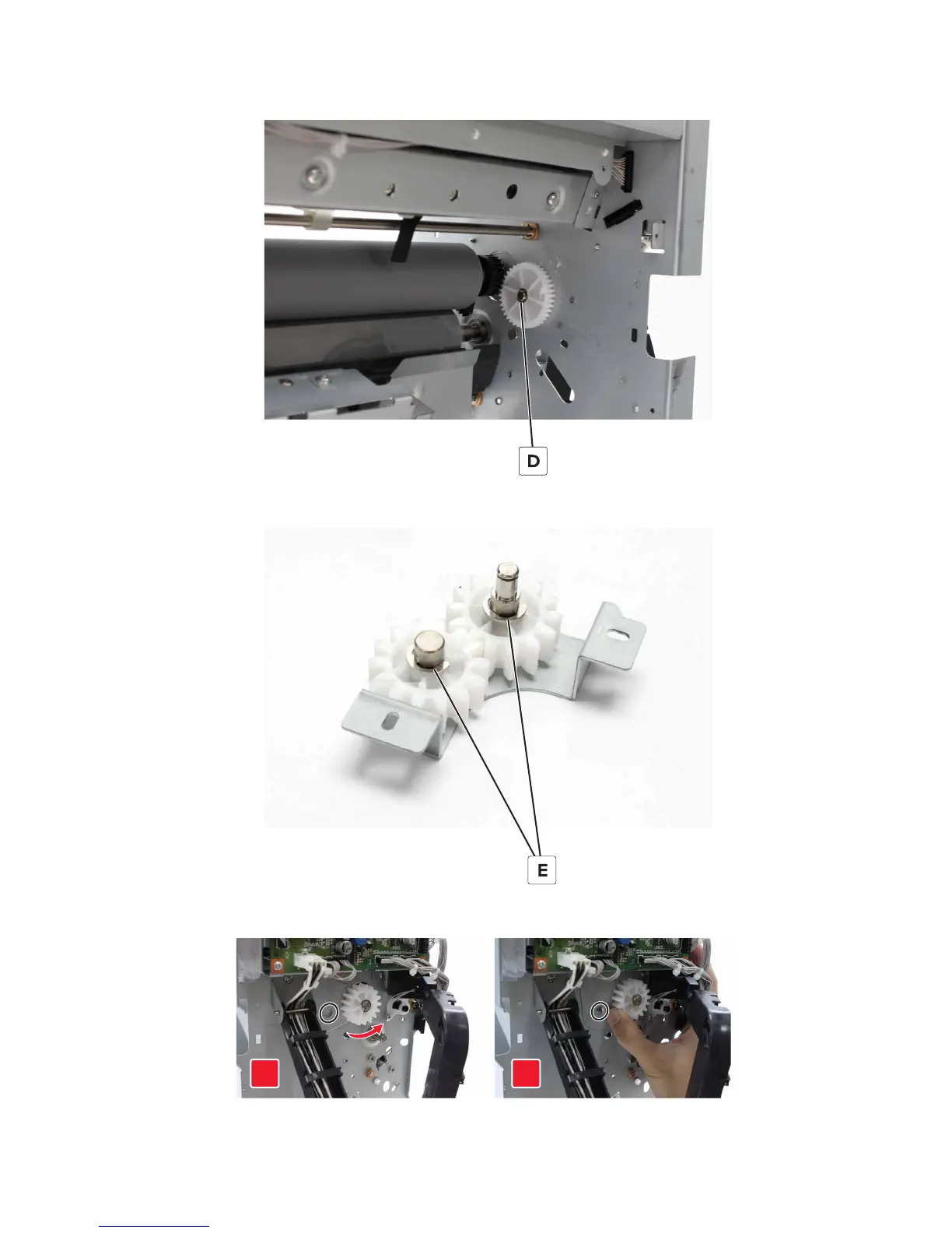 12 Remove the two clips (E), and then remove the gears.
