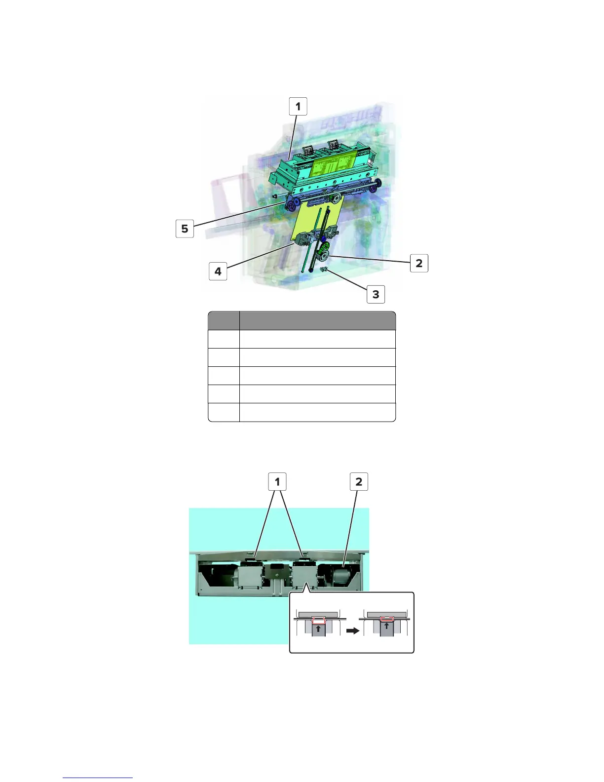 The motor (booklet maker staple unit) controls the stapling process. The paper stack is held between the paper press