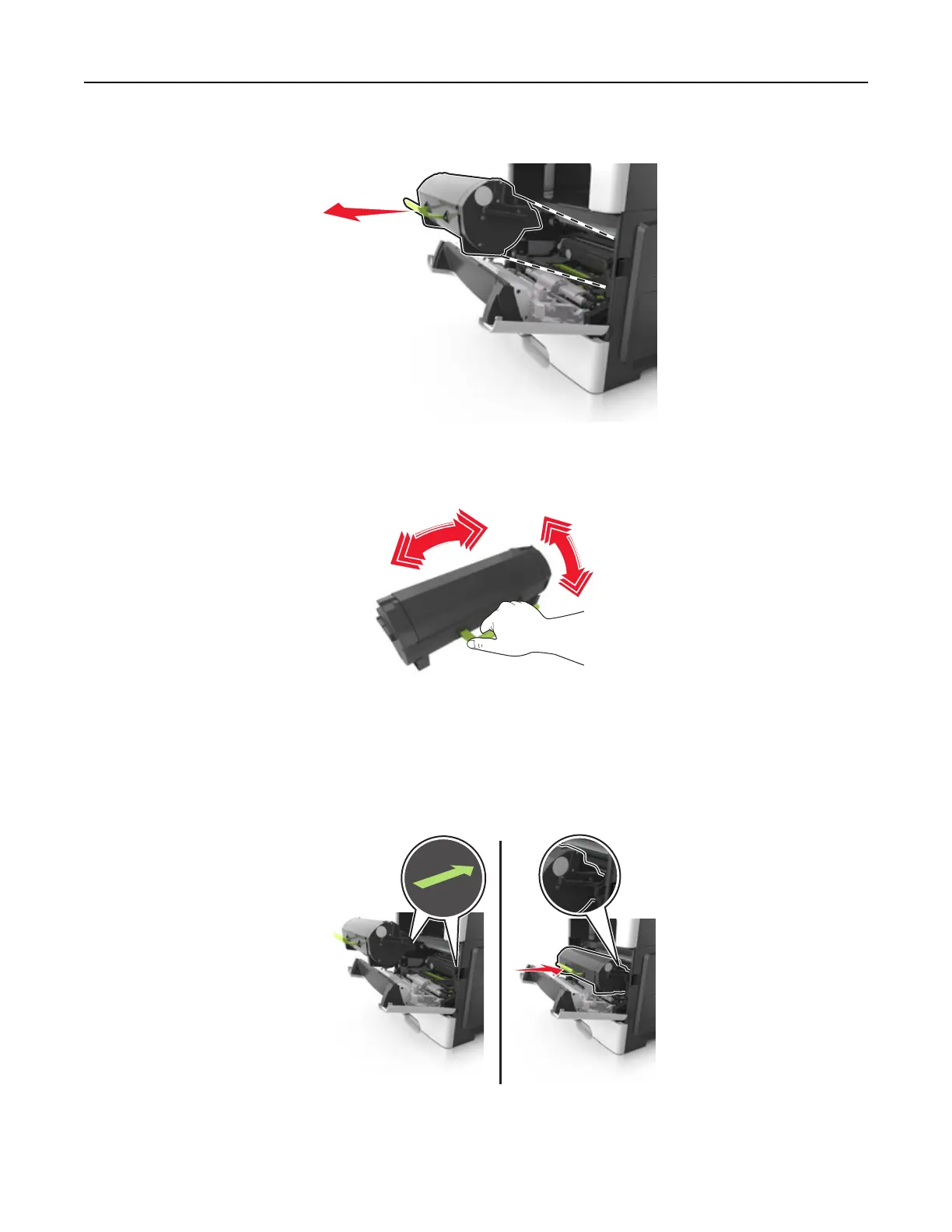 5 Insert the toner cartridge into the printer by aligning the side rails of the cartridge with the arrows on the
