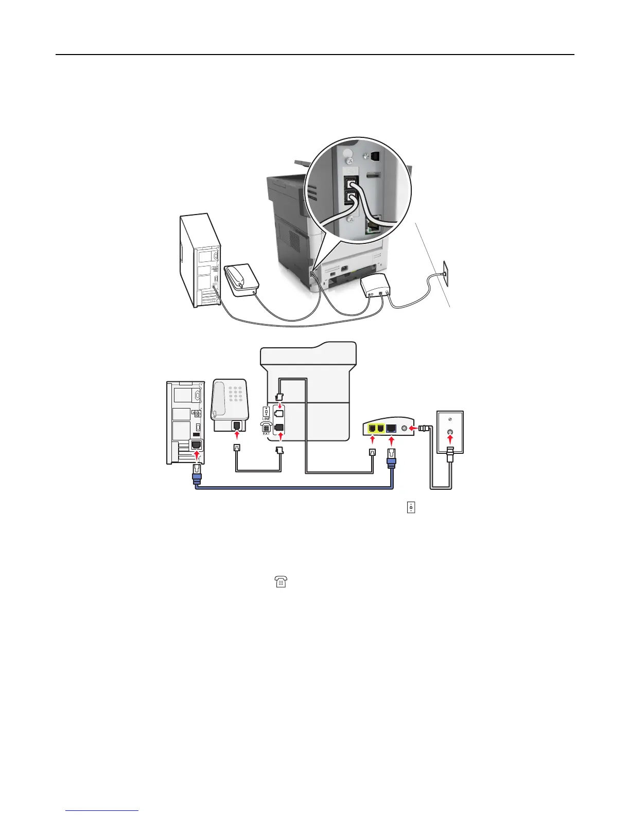 printer into the second telephone port. You can use a phone splitter. Plug the phone splitter into the Phone Line