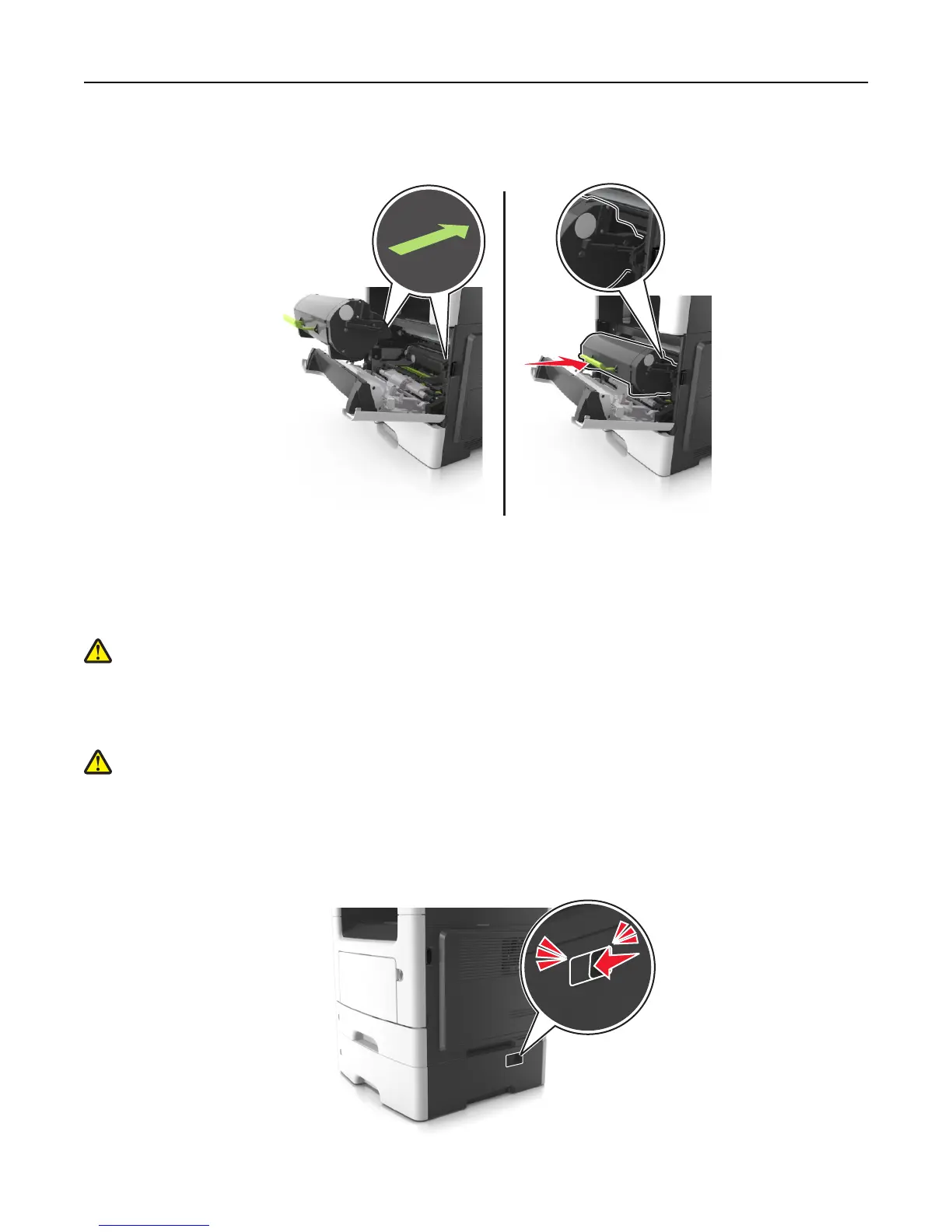 7 Insert the toner cartridge into the printer by aligning the side rails of the cartridge with the arrows on the side rails