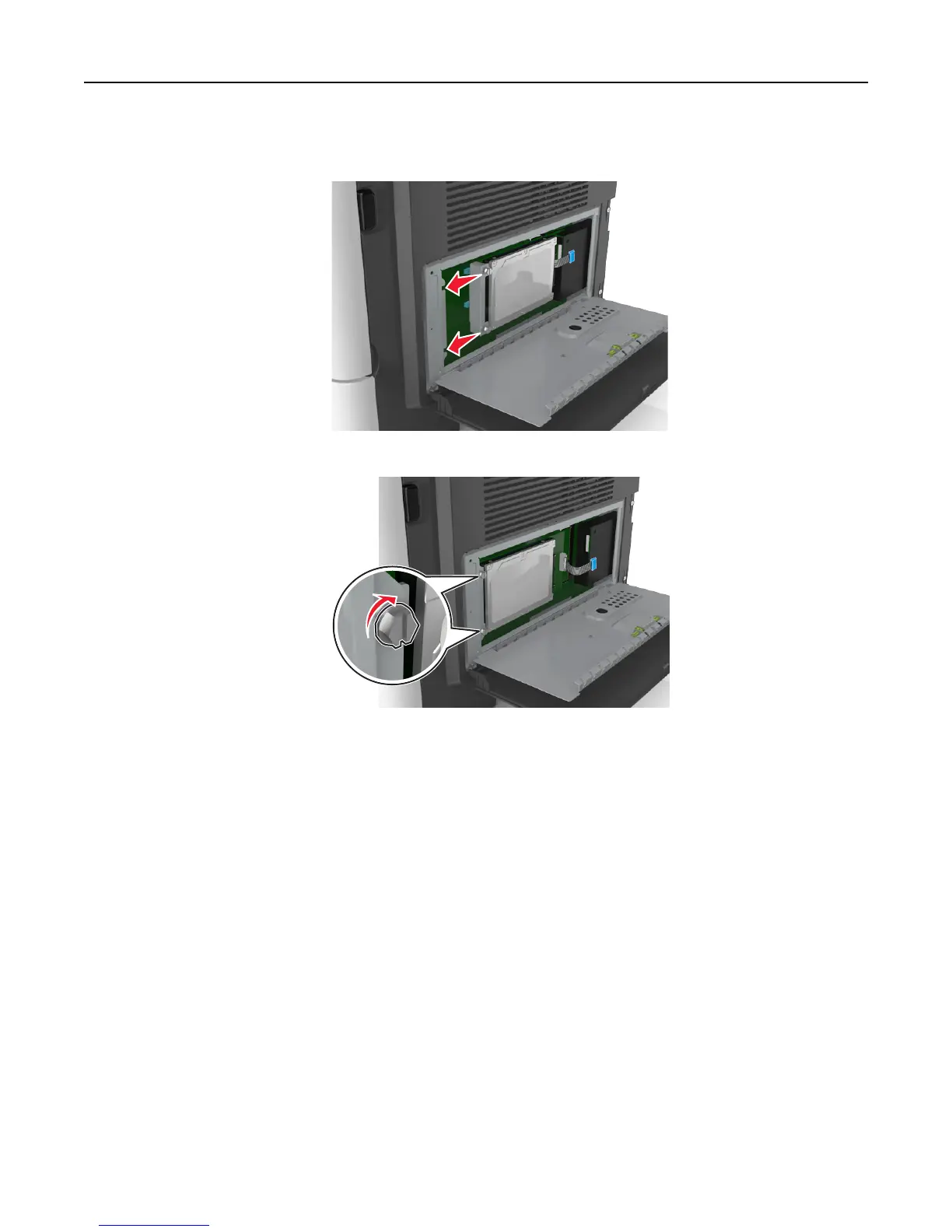c Align the screws on the printer hard disk to the slots on the controller board bracket, and then slide the printer