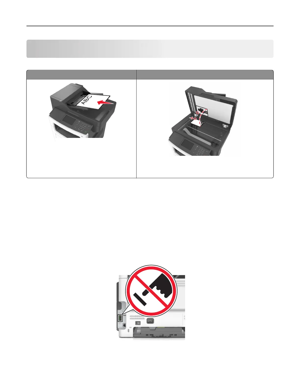 Warning—Potential Damage: Do not touch the cables or the printer in the area shown while actively sending