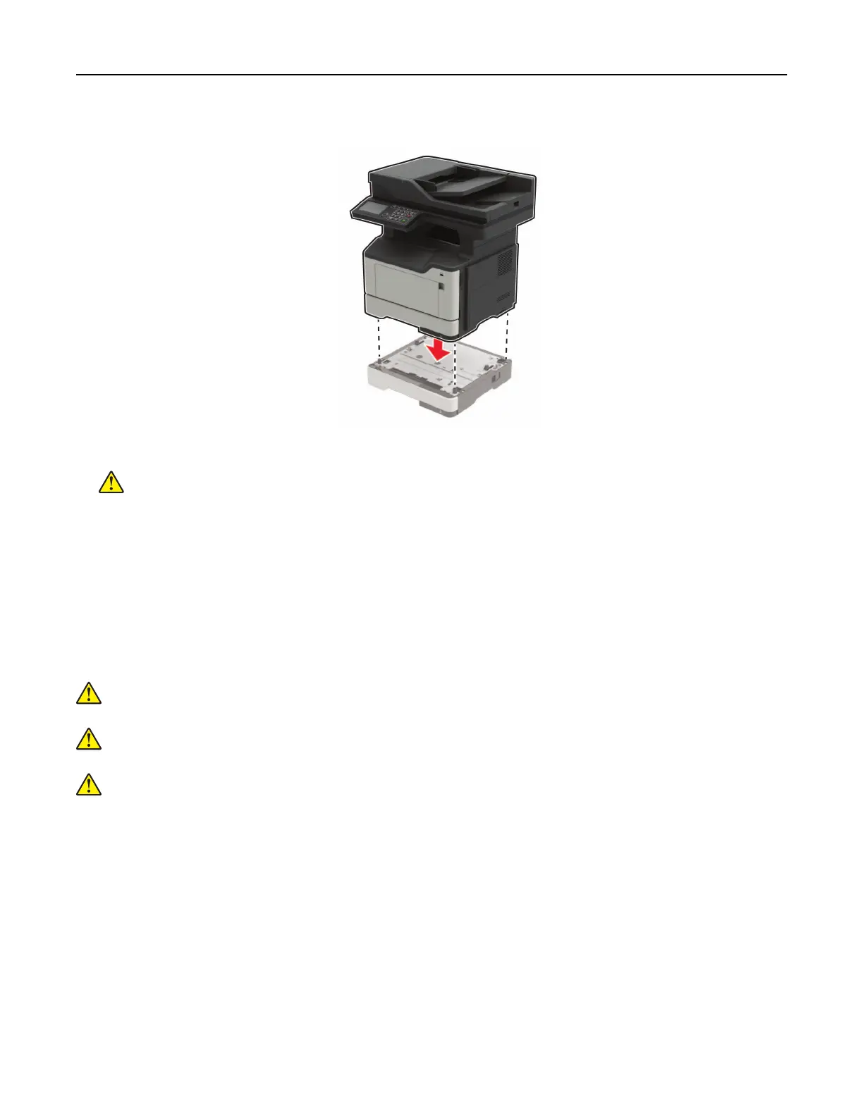 9 Align the printer with the optional tray, and then lower the printer until it clicks into place.