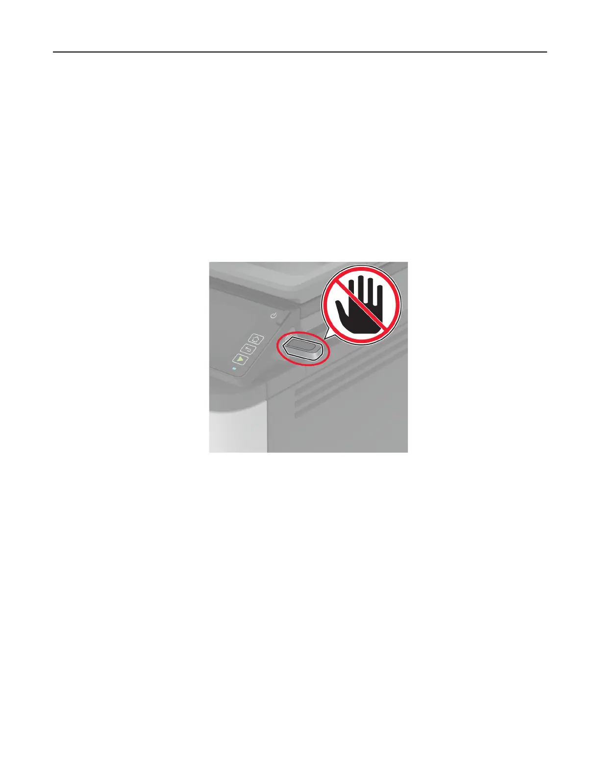 Warning—Potential Damage: To avoid loss of data or printer malfunction, do not touch the flash drive or