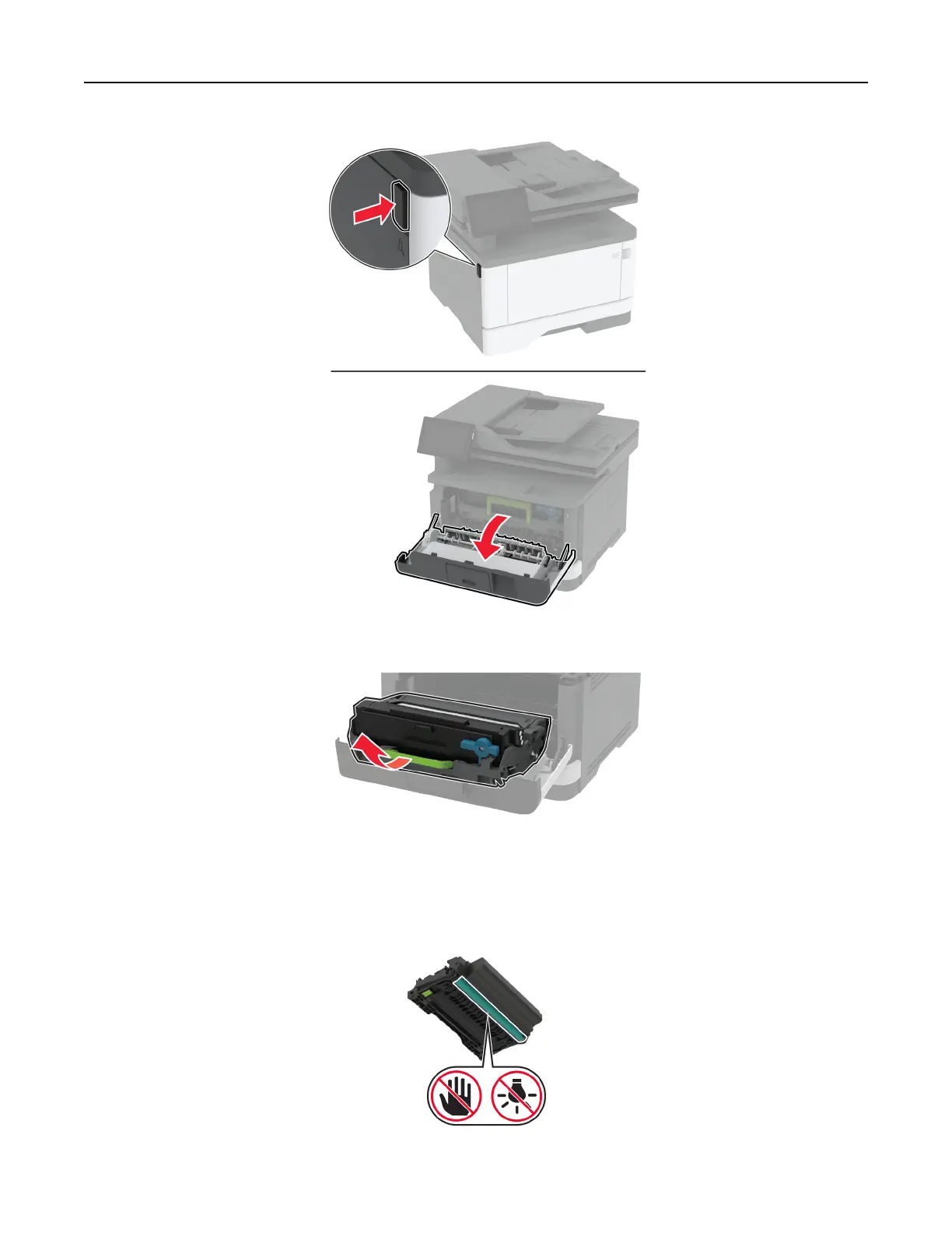 Warning—Potential Damage: Do not touch the photoconductor drum. Doing so may