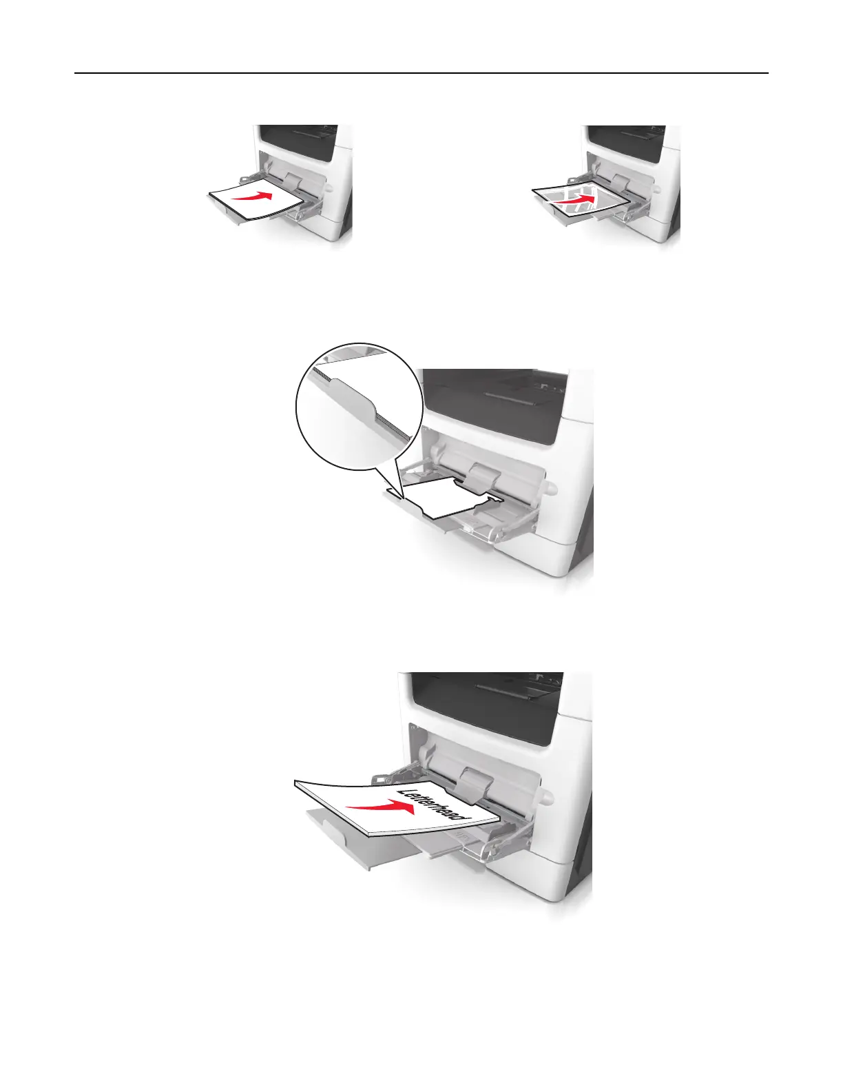• Load letterhead faceup with the top edge entering the printer first. For two‑sided (duplex) printing, load