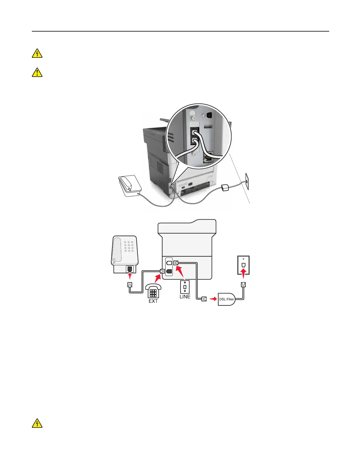 Note: To connect a telephone to the printer, remove any installed adapter plug from the telephone port of
