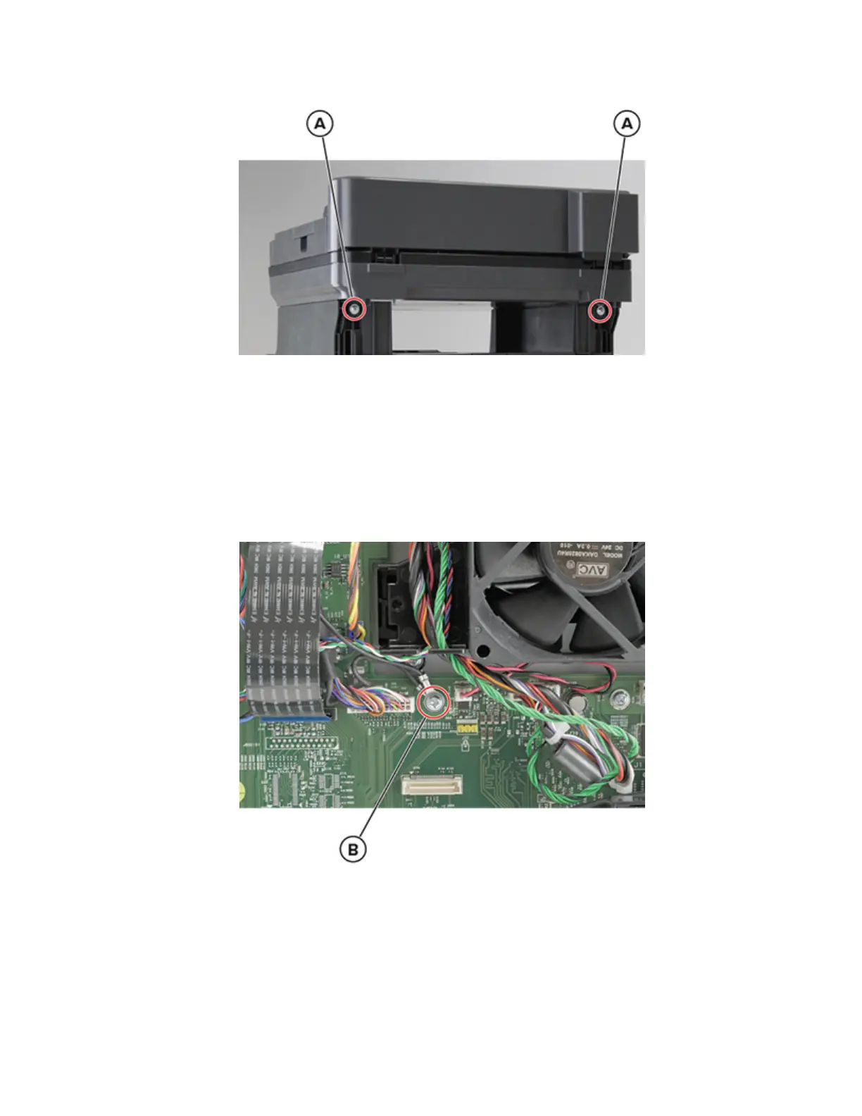 4 From the controller board, remove the screw (B), and then disconnect the following cables: