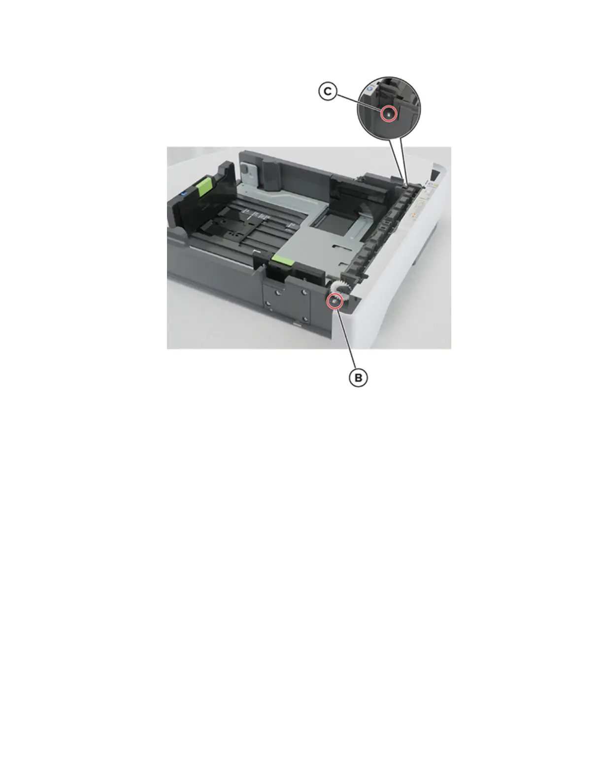 3 Remove the screw (B) on the left side. Do the same for the screw (C) on the opposite side.