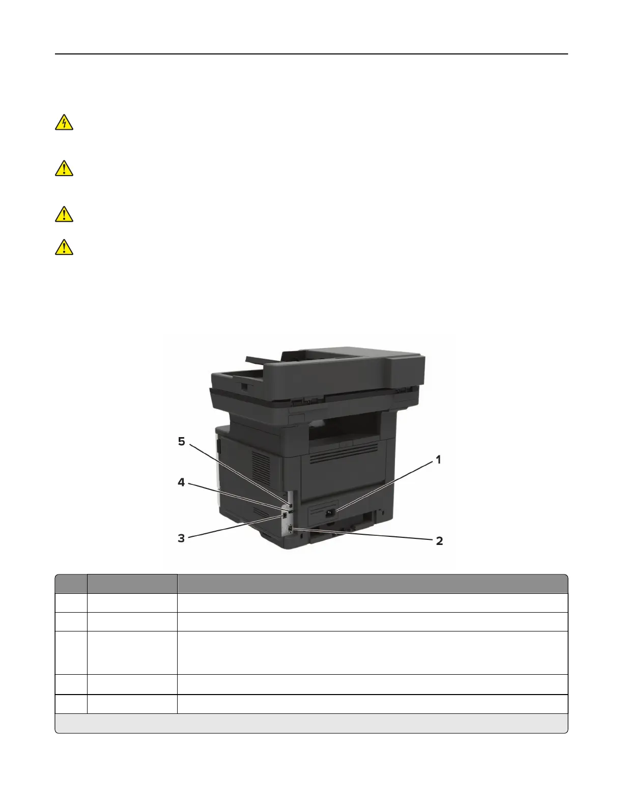 3 LINE port Connect the printer to an active telephone line through a standard wall jack (RJ‑11), DSL