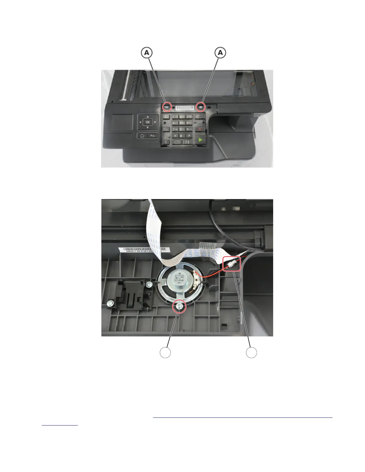 5 Remove the screw (B), and then disconnect the speaker cable (C).