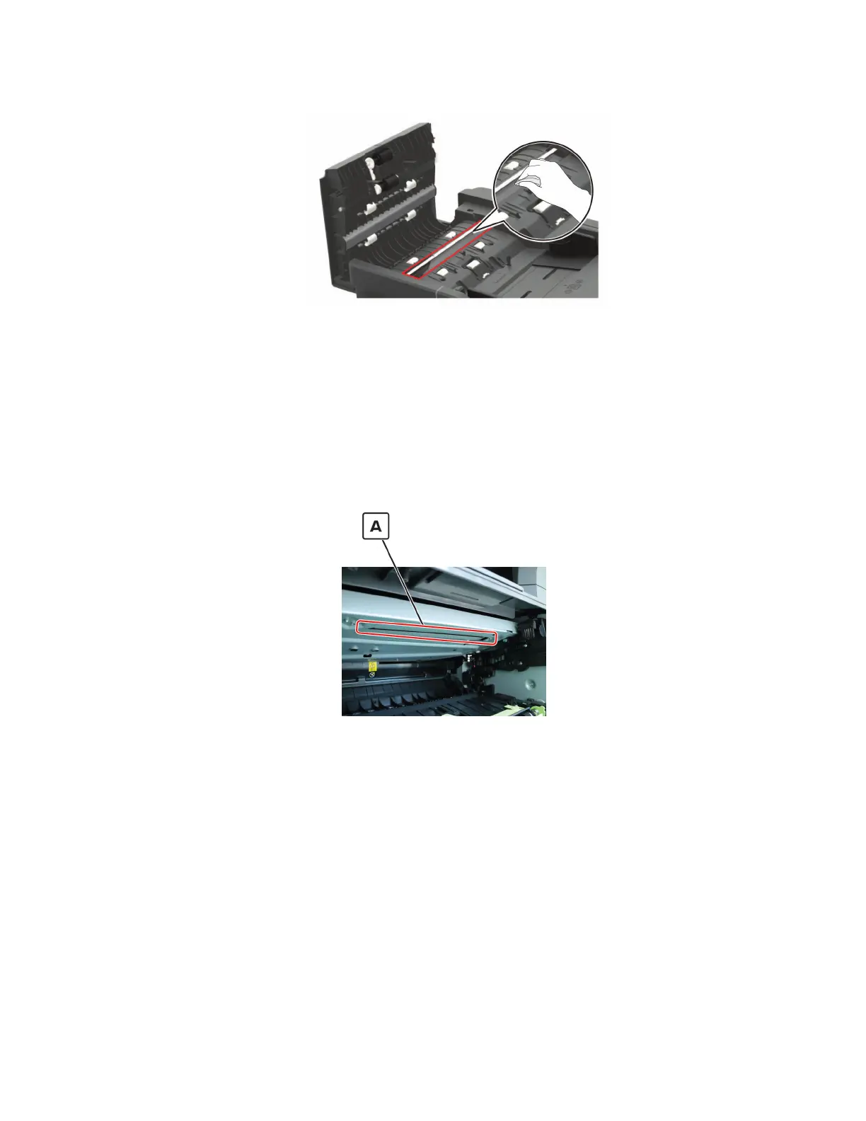 3 From the printhead access opening (A) in the top of the frame at the front of the printer,