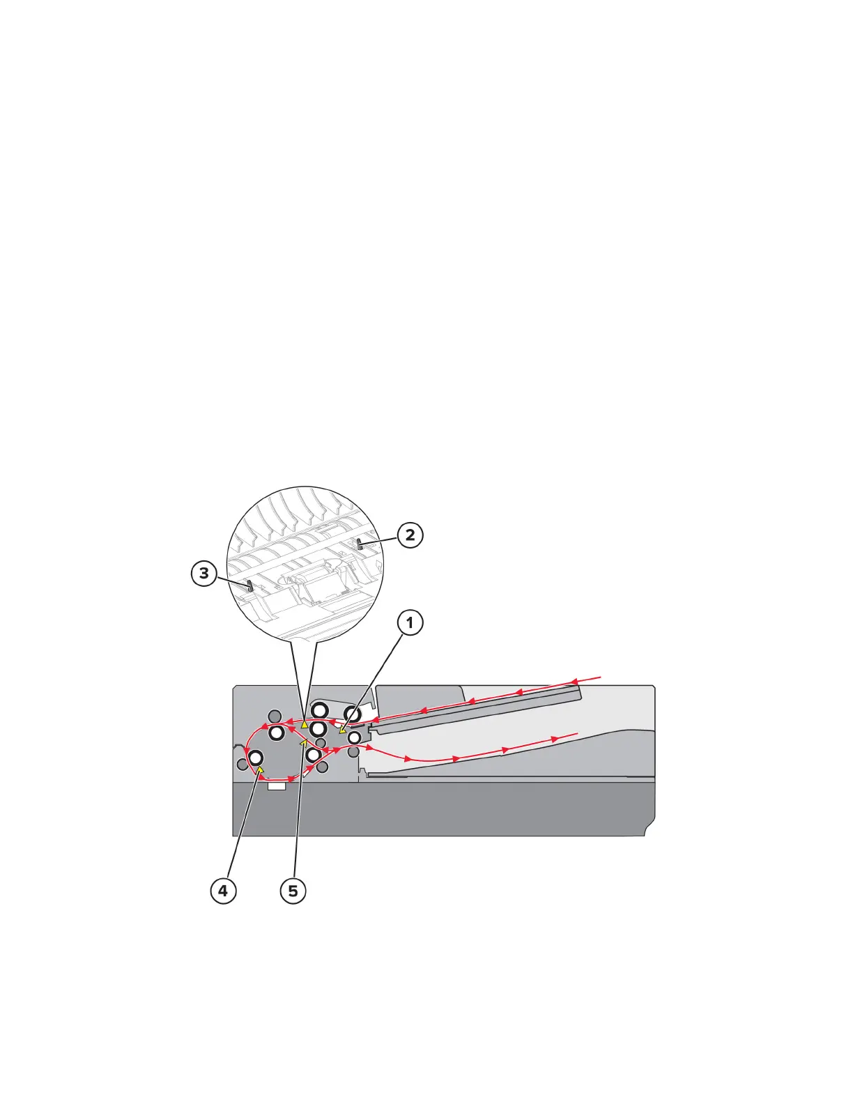 If the scan job is simplex, exit roller 1 advances the paper until it is picked up and moved by the exit roller 2 into