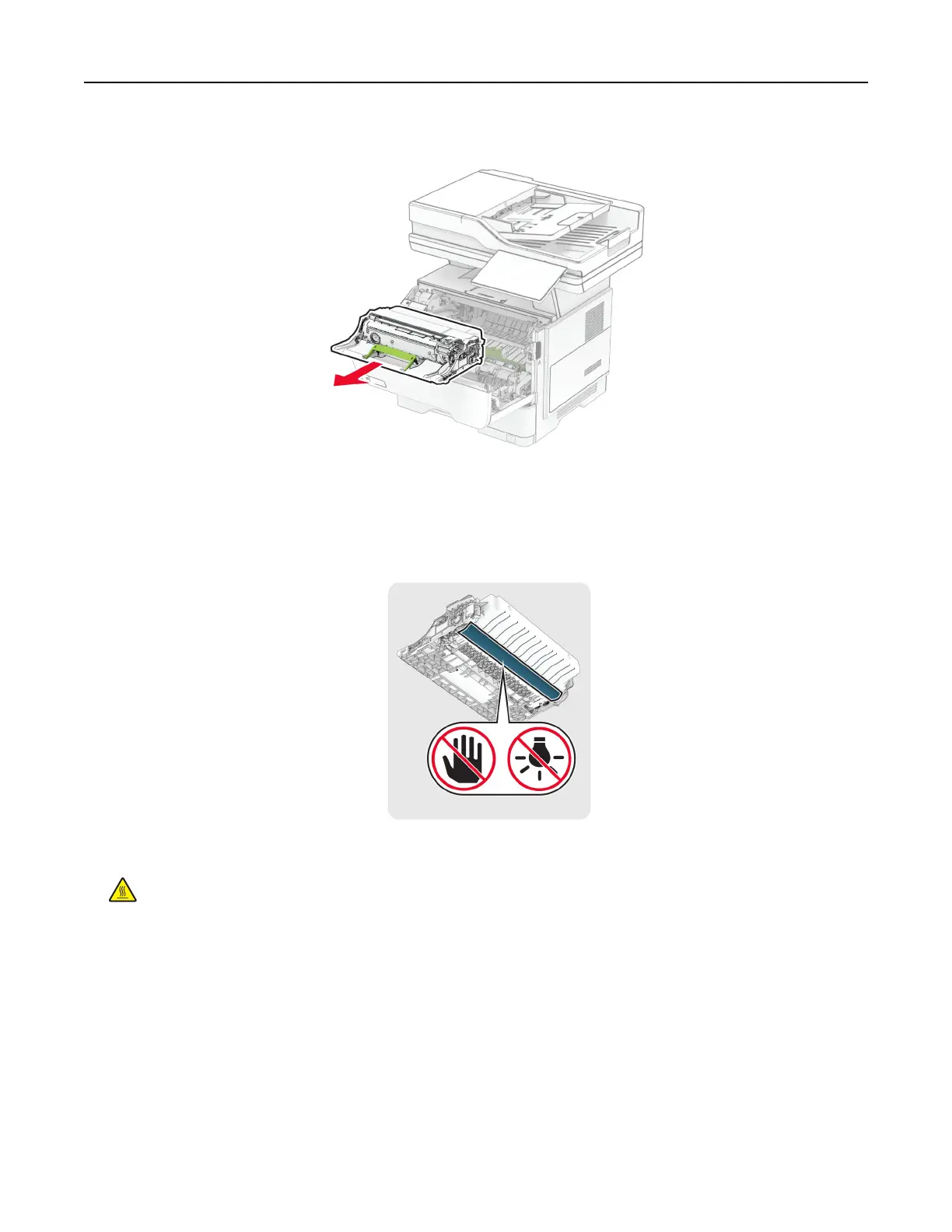 CAUTION—HOT SURFACE: The inside of the printer might be hot. To reduce the risk of injury from a