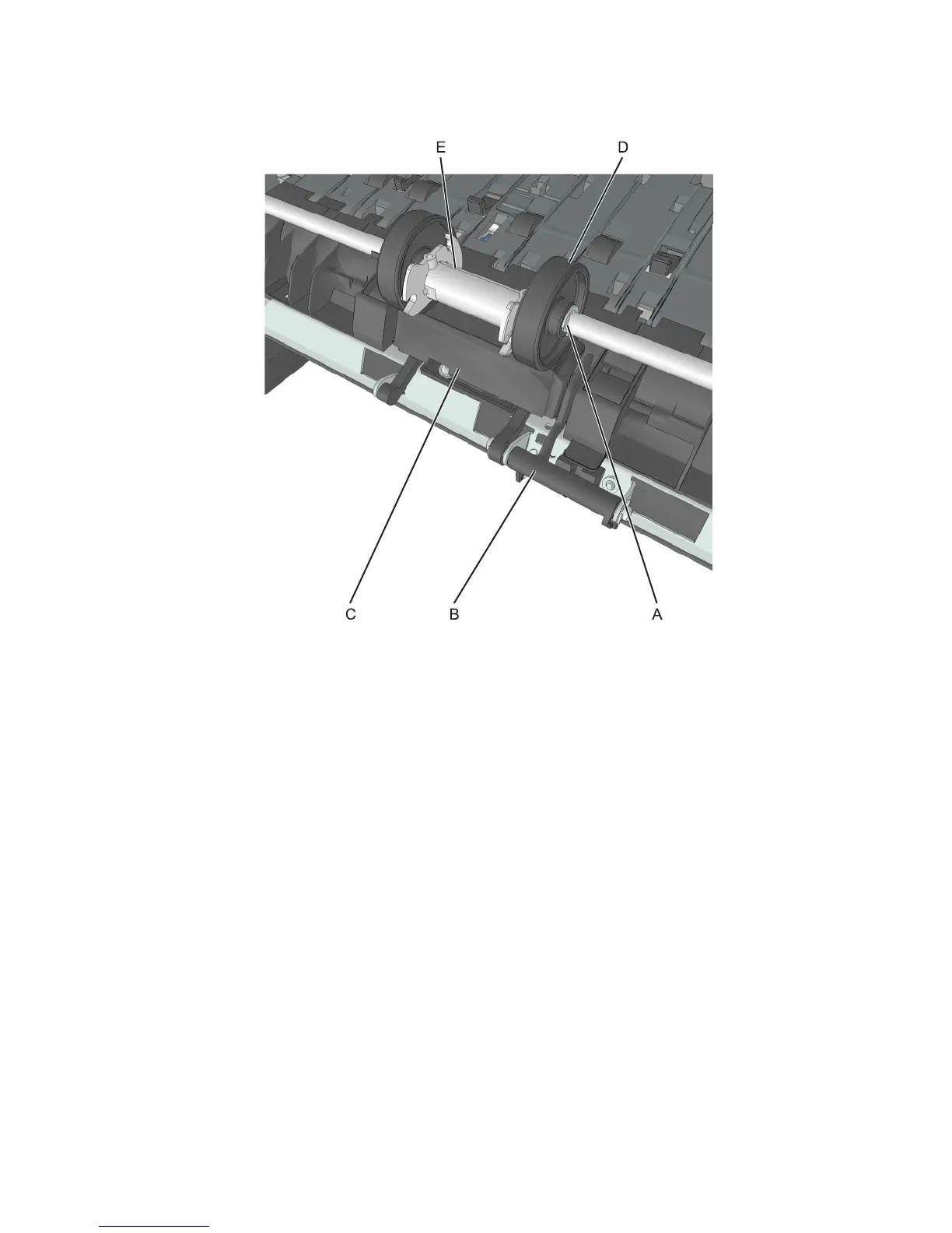 7 While pressing down the MPF sensor flag (B) and separator pad (C), move the restraint roller (D) and MPF pick roller