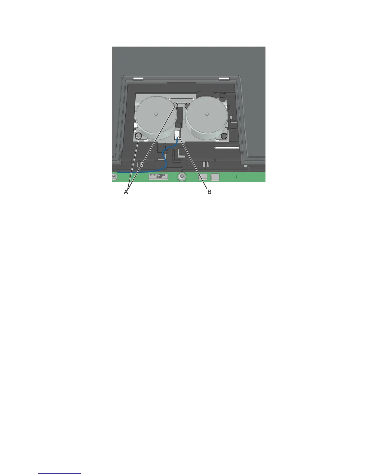 3 Disconnect the motor cable (B), and remove the tamper motor.