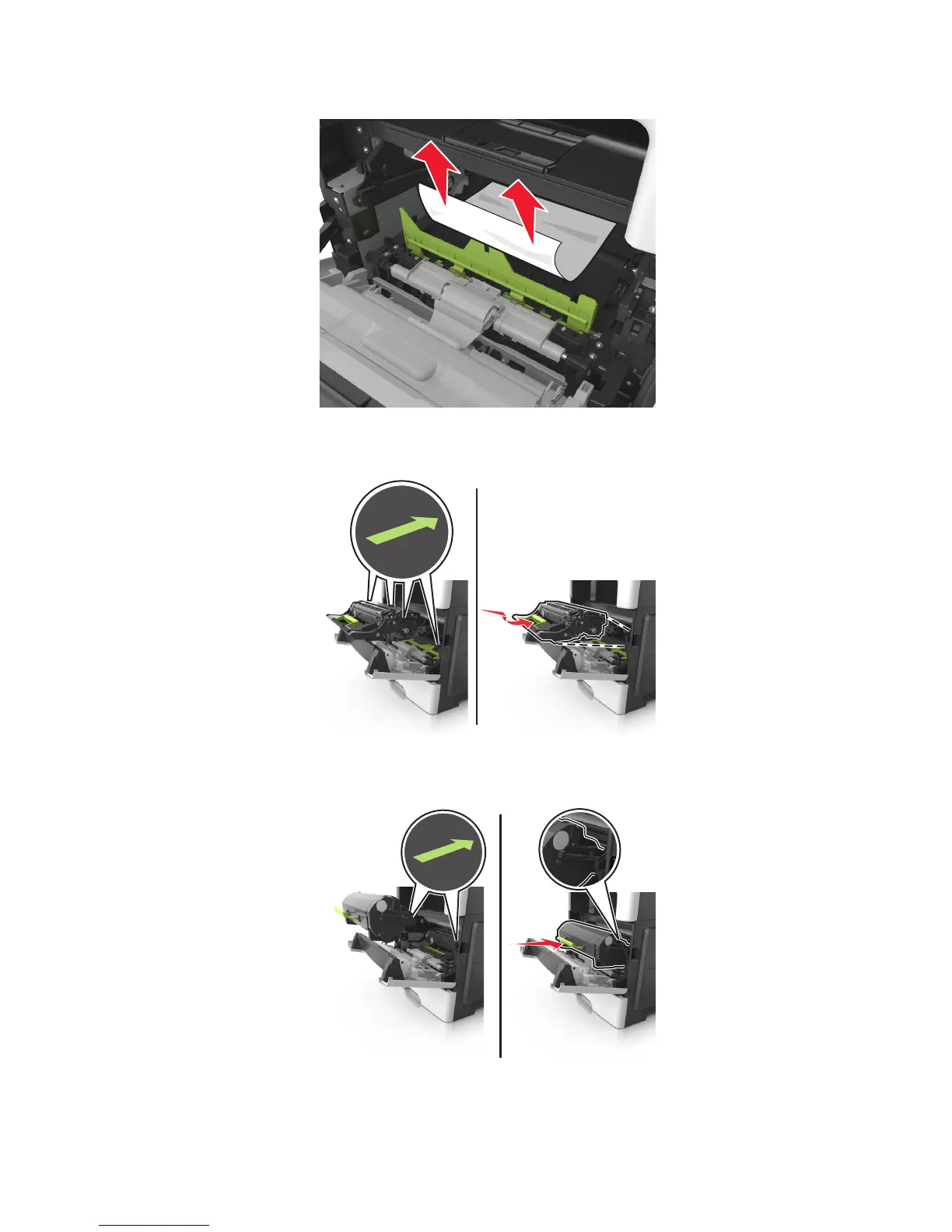 8 Insert the toner cartridge by aligning the side rails of the cartridge with the arrows on the side rails inside the printer,