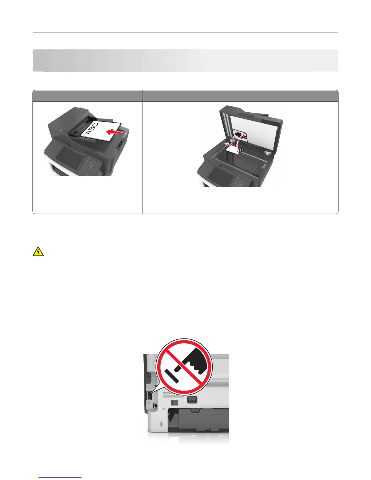 Warning—Potential Damage: Do not touch cables or the printer in the area shown while actively sending or