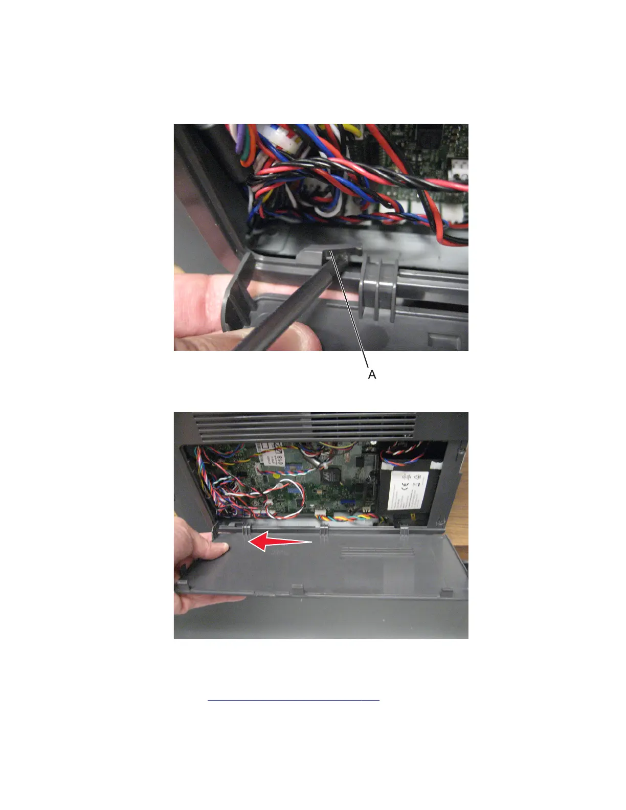 3 Slide the access door to release the hinges, then remove it from the right cover.