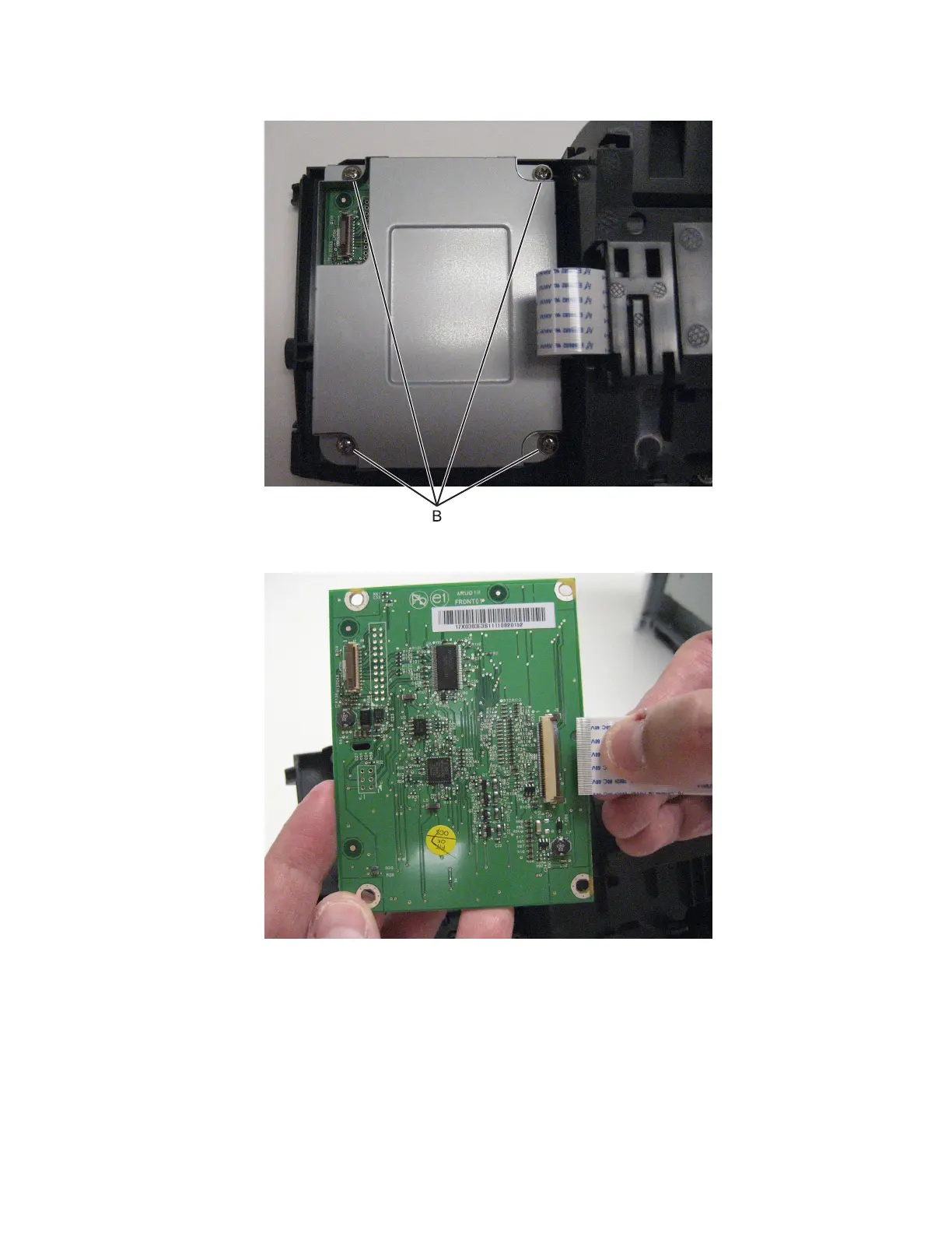 5 Remove the four screws (B), then remove the UICC drip pan from the control panel assembly.