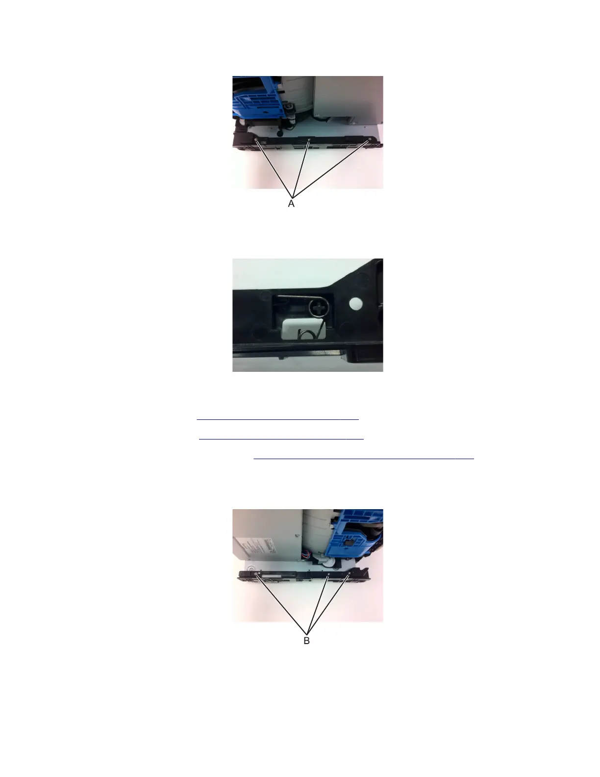 5 Turn the printer on its side (right side down), then remove the three screws (B) from the right guide.
