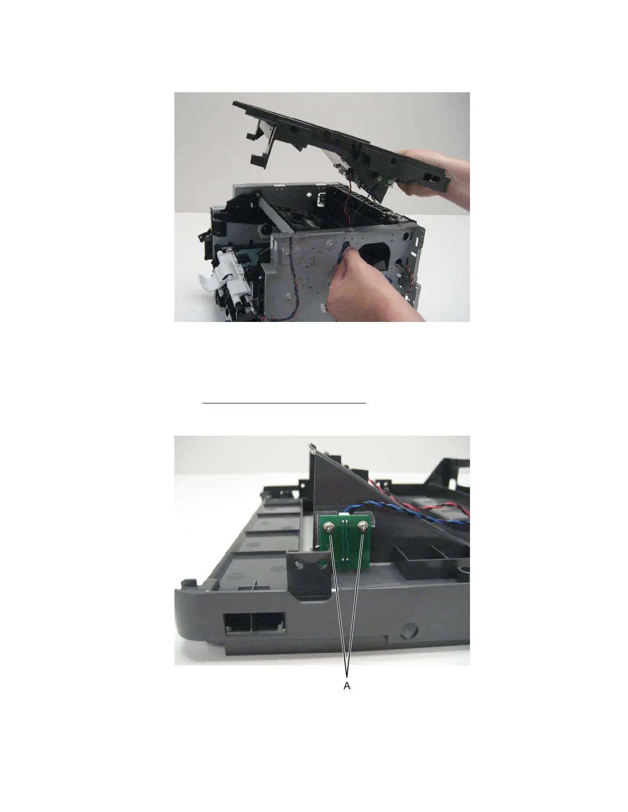 5 Remove the top cover from the printer frame while feeding the bin full sensor cables through the side of