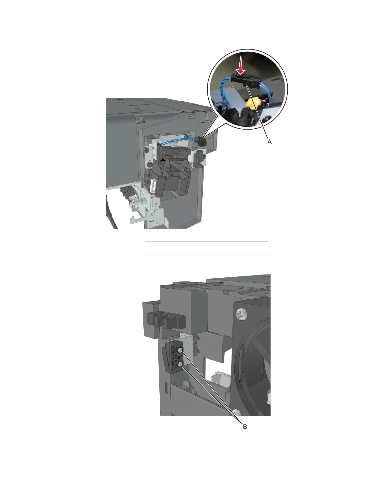 7 Remove the two screws (B) using a #1 Phillips screwdriver, then remove the limit switch.
