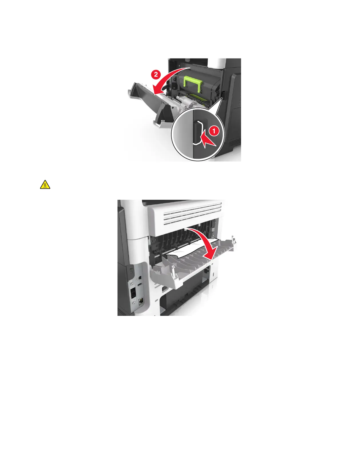 1 Open the front door to loosen the jammed paper in the rear door.