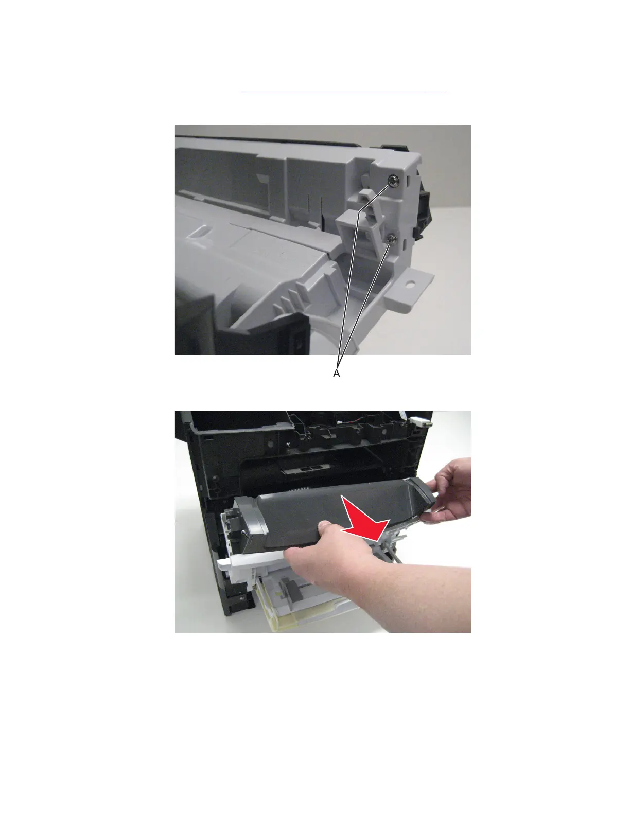 2 Remove the two screws (A) securing the front bin cover to the front access cover.