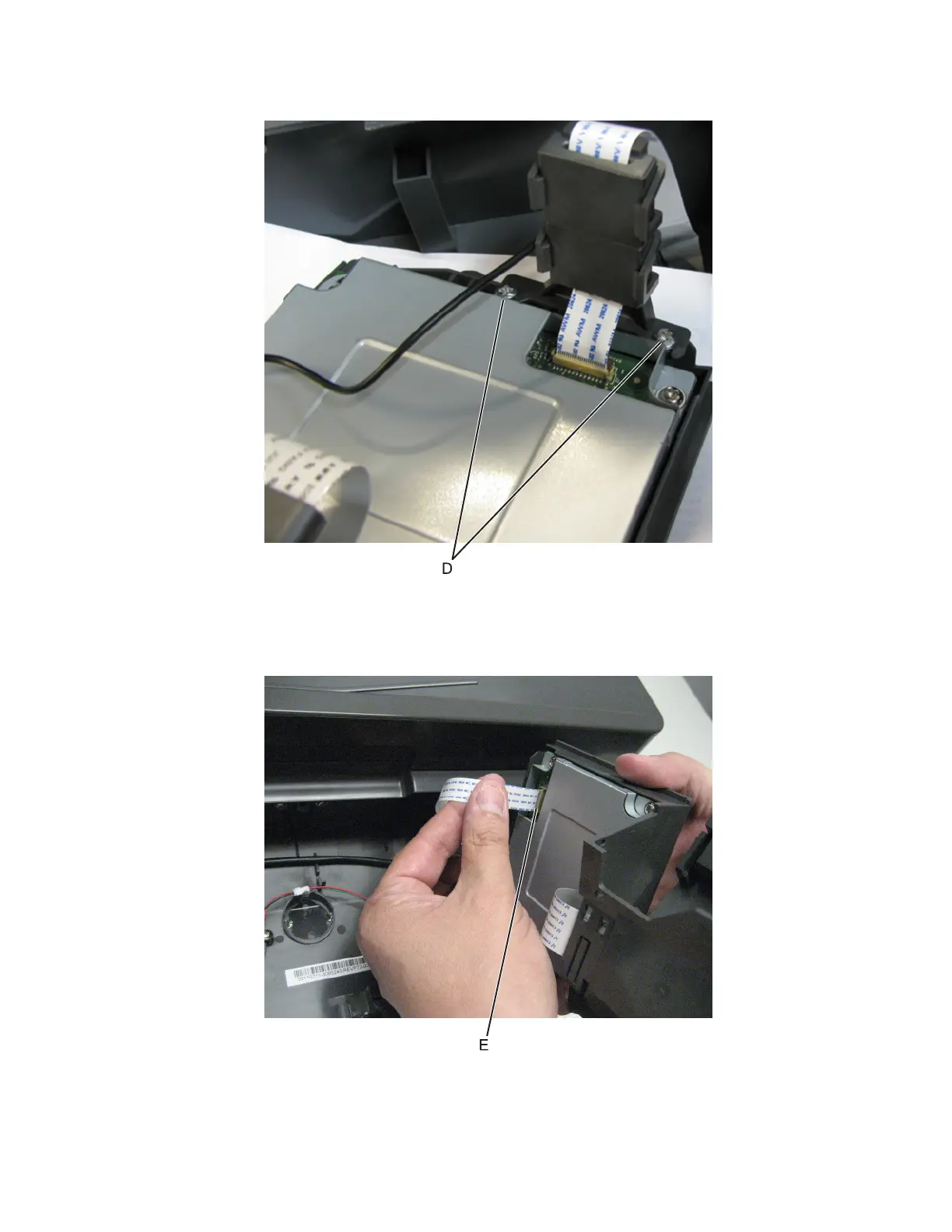 8 Remove the two screws (D) securing the toroid bracket to the control panel cover.