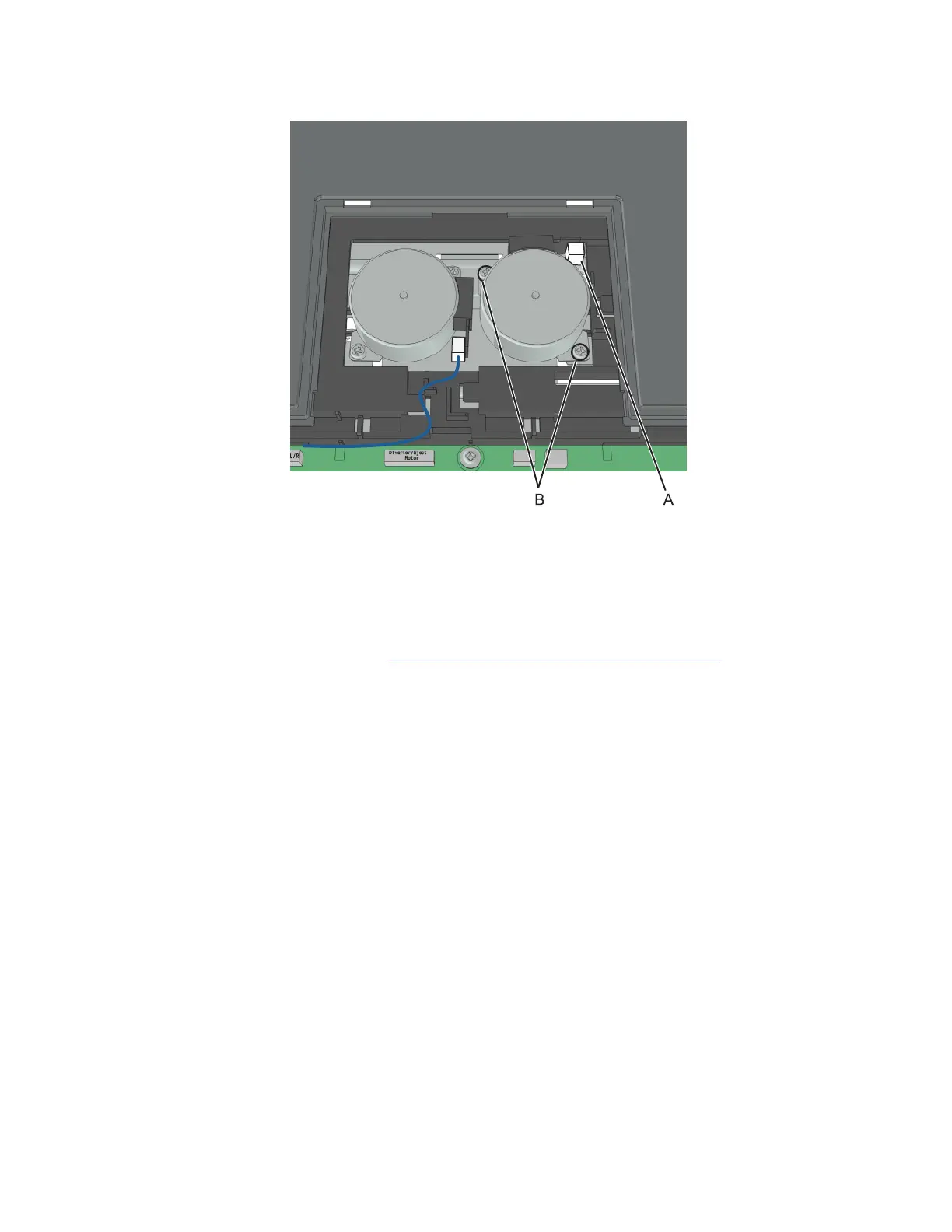 3 Remove the two screws (B) securing the motor, and remove the tamper motor.