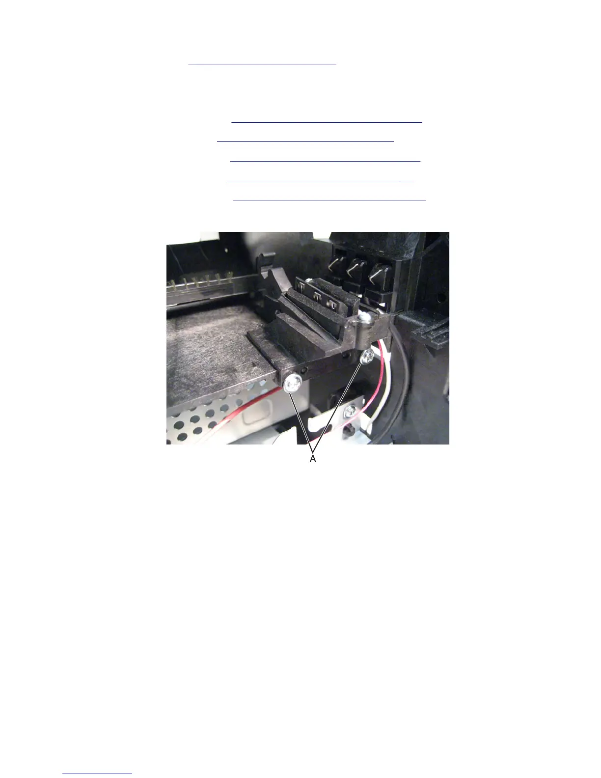 12 Remove the two screws (A) securing the toner level contact to the machine.