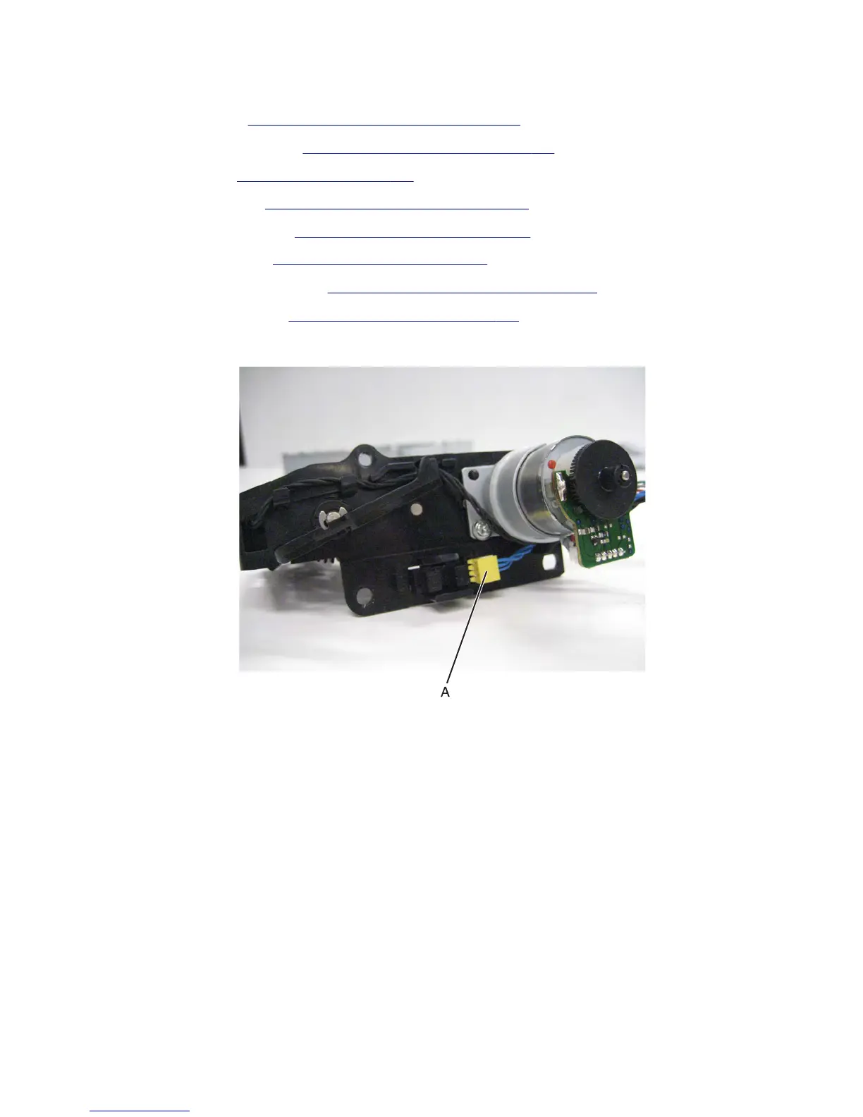 9 Disconnect the cable (A) from the sensor (tray 1 media out).